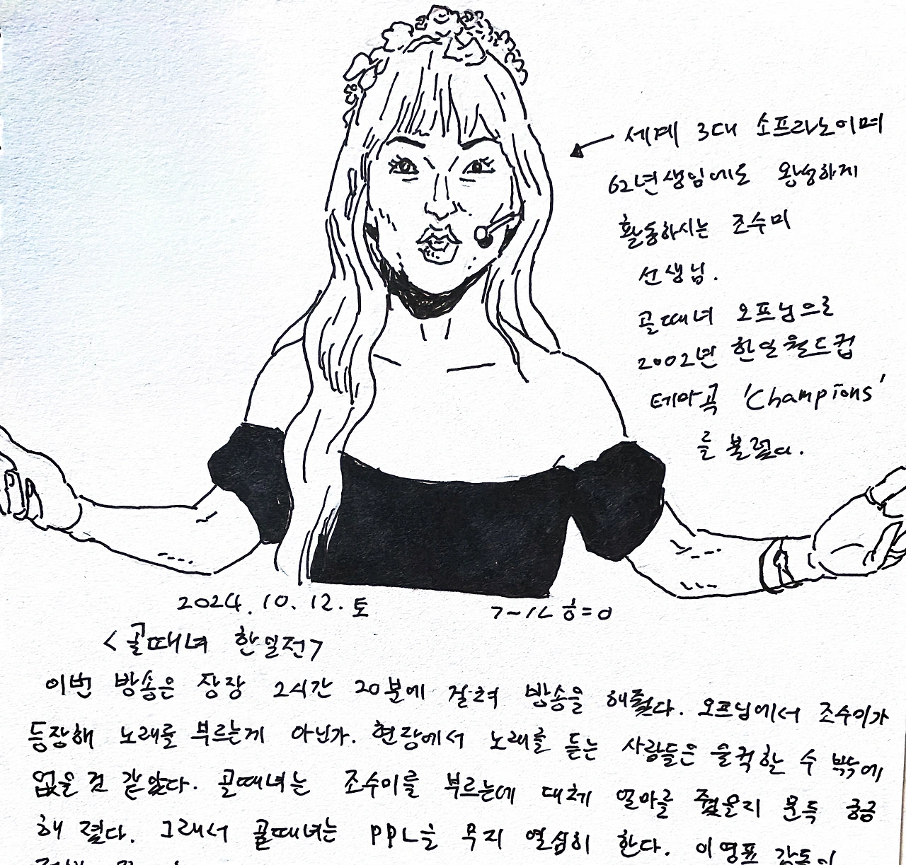 이번 방송은 장장 2시간 20분에 걸쳐 방송을 해줬다. 오프닝에서 조수미가 등장해 노래를 부르는게 아닌가. 현장에서 노래를 듣는 사람들은 울컥할수 밖에 없을 것 같았다.골때녀는 조수미를 부르는데 대체 얼마를 줬을지 문득 궁금해졌다. 그래서 골때녀는 PPL을 무지 열심히 한다. 이영표 감독이 전반끝난후 락커룸에 모인 선수들에게 자연스럽게 협찬 제품을 권하는 장면이 나온다. 엎치락 뒤치락 하는 가운데 내가 원하는대로 한국이 4:3으로 졌다. 일본한테 저야 골때녀 선수들도 더 열심히 할 원동력이 생길거라고 생각했기 때문이다. 방송끝에 한글날에 일본에 간 이영표 감독을 보여준걸 보니 일본에서 복수전 경기가 벌어지는거 같아서 또 기대가 되었다. 일본에서는 요코하마와 마시마 선수가 너무나 눈에 띄게 잘했다. 특히 마시마 선수는 축국 프리스타일 경력 20년의 선수라 그런지 그녀가 골을 잡을때마다 감탄을 했다. 일본의 나머지 두선수는 교체를 거의 하지 않았는데, 실력이 안되서 교체를 안한거 아닌가 싶었다. 좀 어느정도 하는 선수들을 뽑지 하는 안타까움도 들었다. 그런데, 요코하마와 마시마가 워낙 잘해서 결국 4:3으로 패.