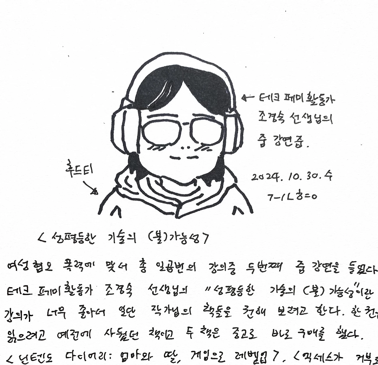 여성혐오 폭력에 맞서 총 일곱번의 강의중 두번째 줌강연을 들었다. 테크페미활동가 조경숙 선생님의 “성평등한 기술의 (불)가능성“이란 강의였다. 강의가 너무 좋아서 일단 작가님의 책들을 권해 보려고 한다. 한권은 읽을려고 예전에 사뒀던 책이고 두 책은 중고로 바로 구매를 했다. <닌텐도 다이어리: 엄마와 딸, 게임으로 레벨업>, <엑세스가 거부되었습니다: 전지적 여성 시점으로 들여다보는 테크 업계와 서비스의 이면>, <아무튼, 후드티: 그리고 어떻게든 절망에 지지 않겠다는 결의를 다졌다>이다. 제목들이 다 땡기지 않는가? 게임을 전혀 안하는 사람이다보니 게임쪽이나 온라인 폭력에 대한 지식이 무지한 편인데, 많은 이야기를 공부하는 마음으로 들은 시간이었다. 그림은 줌 장면을 캡쳐할 수가 없어서, 연필로 선생님의 모습을 간단히 그려서 수업이 끝난후 네임펜으로 옮겨 그렸다. 기술이 발달하지만 그에 대한 대처 방법이 없었던 것이 아니라 안하고 있었다는 것. 기존에 나온 해결책이라도 실행에 옮기게 하려면 시민들이, 자꾸 목소리 내고 공부하고 의견을 내서 압박해야 한다는 걸 새삼 인식한 시간이었다.
