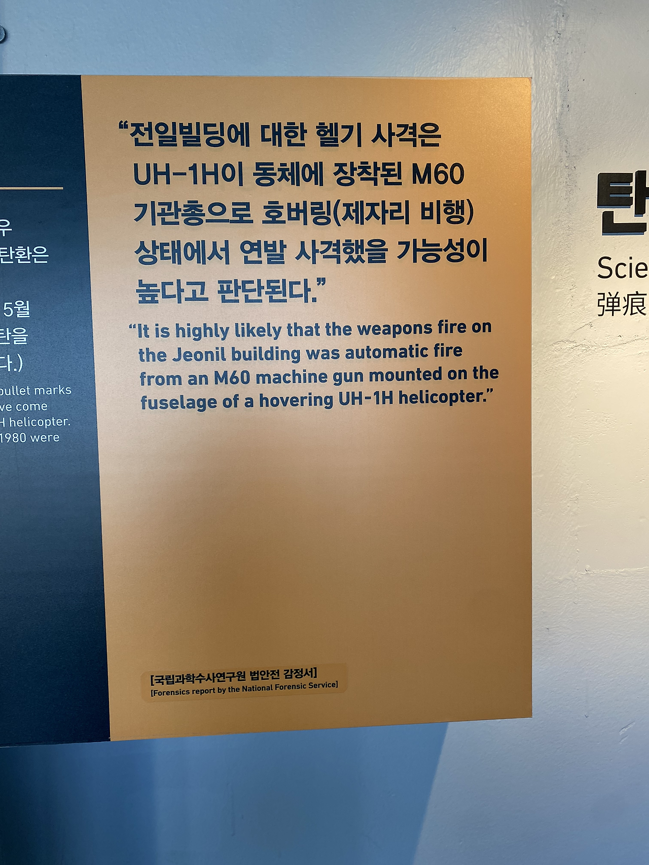 숙소에서 9시에 나와 구전남도청 앞에 있는 전일빌딩245에 들렸다. 10층 9층이 5.18 그당시의 상황들을 설명해 놓은 전시관이다. ’245‘는 빌딩에서 발견된 총탄 자국의 숫자이기도 하다. 그날 당시 헬기에서 사격을 당한 상황을 VR로 볼수 있는 곳도 있었는데, 직접 체험해보니 너무나도 무서운 기분이 들었다.