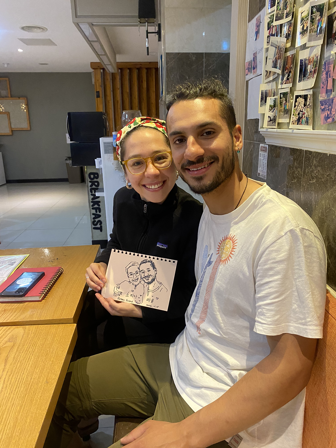 그들에게 작은 선물을 주고 싶어 커풀 사진을 찍어 간단히 그림을 그려서 선물했다. 내가 영어를 잘했다면 좀더 깊은 대화를 하는 재미를 오래 누렸겠지만, 짧은 단어로 대화를 나누려니 한계가 있어서, 한글을 스페인어로 번역한 알파고를 보여주고 헤어졌다. “당신들은 피곤하지 않나? 나는 책을 조금 읽다가 자려고 한다” 커풀은 근처 마트에 장을 보러가고 나는 다시 책을 조금 보려고한다. 책이야 늘 읽는거고, 외국인들과 대화는 경험은 재미있기도 새로운 경험이라 종종 이렇게 어설픈 영어로 말을 걸곤 한다. 물론 피곤할때는 그냥 말걸지 않고 조용히 있는 편이고.