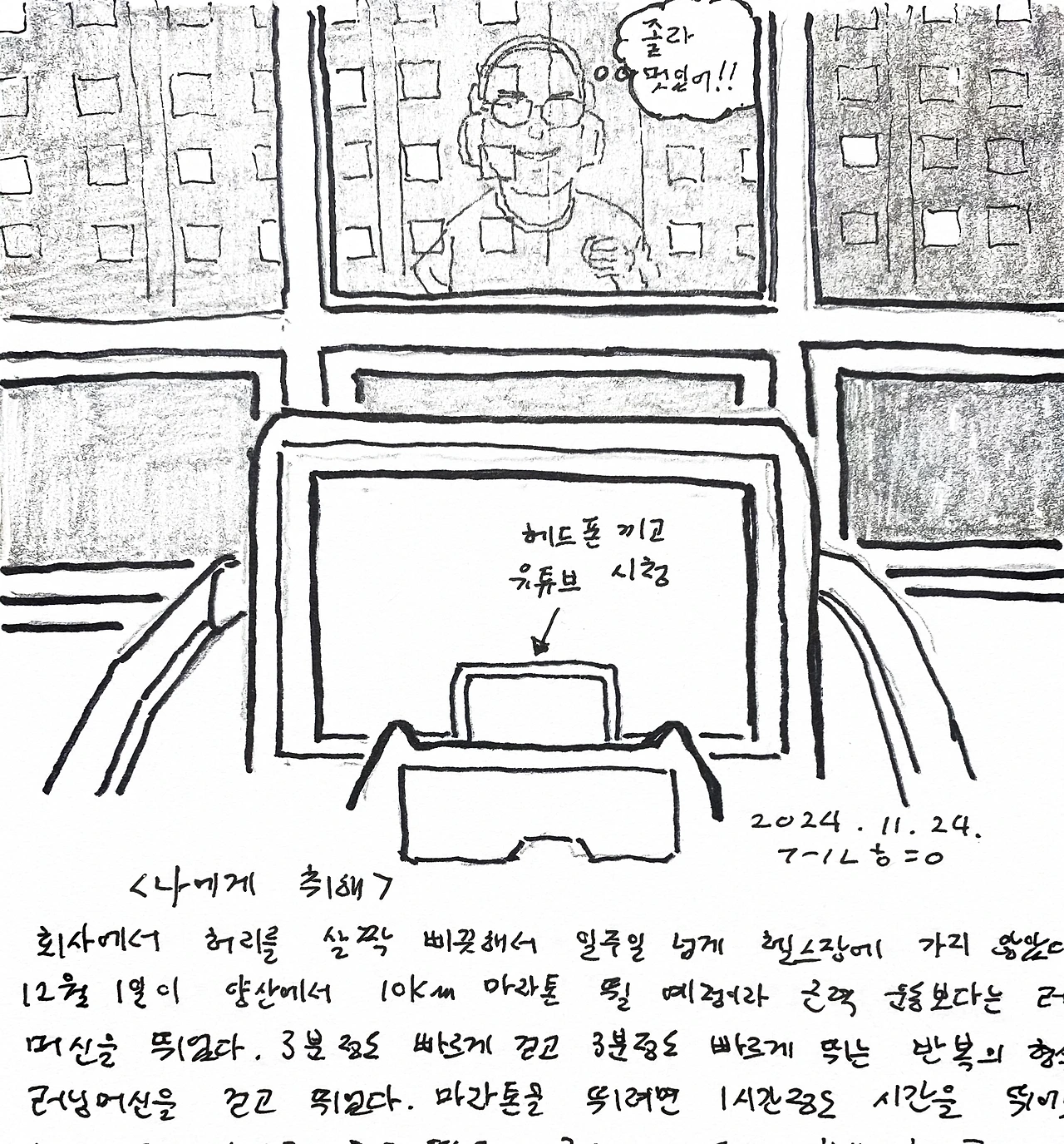 회사에서 허리를 살짝 삐끗해서 일주일넘게 헬스장에 가지 않았다. 12월 1일이 양산에서 10km 마라톤 뛸 예정이라 근력 운동보다는 러닝 머신을 뛰었다. 3분정도 빠르게 걷고 3분정도 빠르게 뛰는 반복의 형식으로 러닝머신을 걷고 뛰었다. 마라톤을 뛰려면 1시간정도 시간을 뛰어봐야 해서 그 시간만큼 걷고 뛰었다. 러닝머신 탈때 항상 헤드폰을 끼고 유튜브 운동영상을 본다. 시간이 금방가고 뛰는게 지겹지 않다. 빠르게 걸을땐 핸드폰을 보다가 다시 뛸땐 영상을 잠시 멈춰두고 앞의 유리창에 비친 나를 보며 뛴다. 창 밖은 아파트가 보이는데, 저녁 6시즈음이면 어두워진다. 흐릿한 내 실루엣이 보이는데, 괜히 멋져보인다. 속으로 ‘졸라 멋지다’라는 말을 계속 한다. 내 오른쪽으로 유리에 비치는 내 뛰는 모습을 보면 확깬다. 별로 빠르지 않은 속도로 엉성하게 뛰는 모습이 확인되기 때문이다. 운동은 자신에게 취해 하면 좋은 자극이 된다. 젊은 여성들이 왜 몸매가 들어나는 레깅스를 입고 운동하겠는가? 자신의 늘씬한 모습을 눈으로 확인하면서 운동하는 것처럼, 별로 빠르게 뛰는것도 아니면서 내 모습에 취해서 오늘도 러닝머신을 탔다.