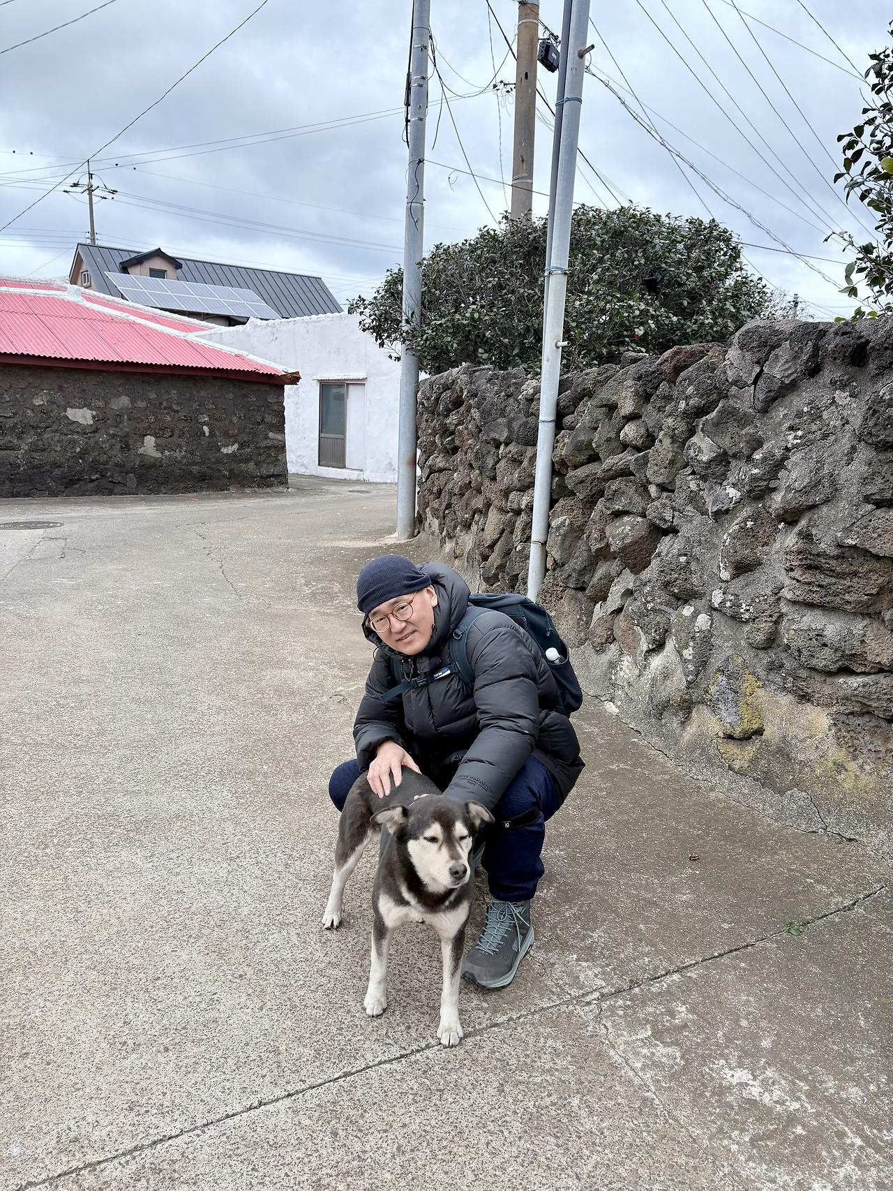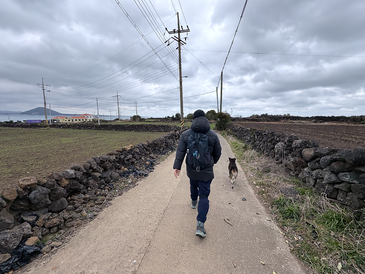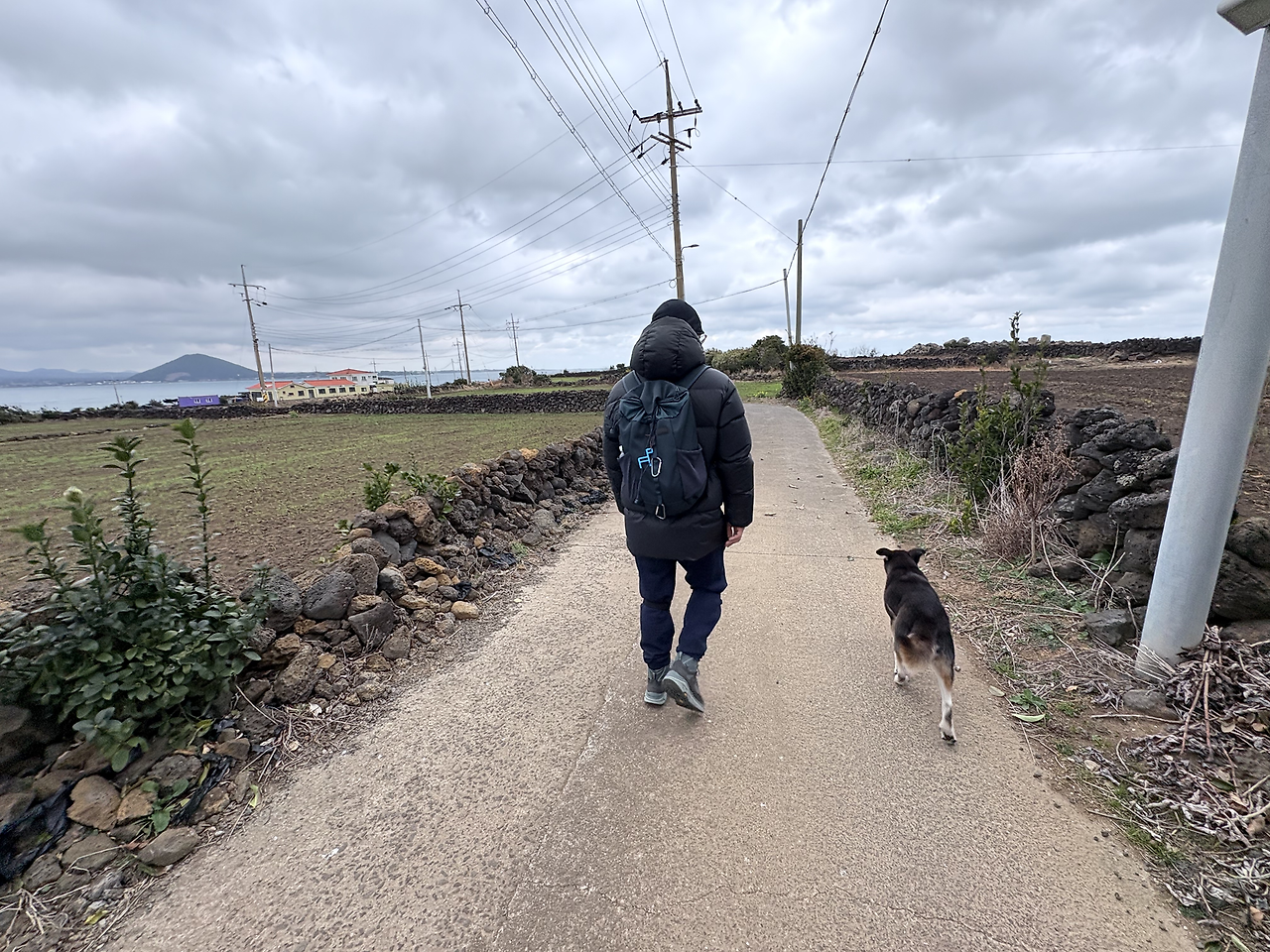 오늘 올레길에 가장 기억에 남는 것은 멋진 자연보다 1km정도 함게 걸은 검은 댕댕이 이다. 덩치가 있어서 성질이 있지 않을까 조심스럽게 다가갔는데, 조용히 다가와 몸을 맡겼다. 한참을 쓰다듬고 이뻐해주고 올레길을 걸을려고 일어섰는데, 마치 올레길을 아는 것처럼 우리와 함께 걷는게 아닌가. 조금 걷다가 돌아갈 줄 알았는데, 우리가 가는 속도보다 5m정도 앞에서 같이 걸었다. 성격도 얼마나 순하고 차분한지 너무 사랑스러운 개였다. 보통은 쓰다듬고 이뻐해주면 흥분해서 발발 거리는데, 이 개는 그냥 몸을 맡기고 그걸 즐기면서도 흥분하지 않고 가만히 있었다. 손을 떼면 나를 처다보더니 우리가 걷는길을 같이 걸었다.