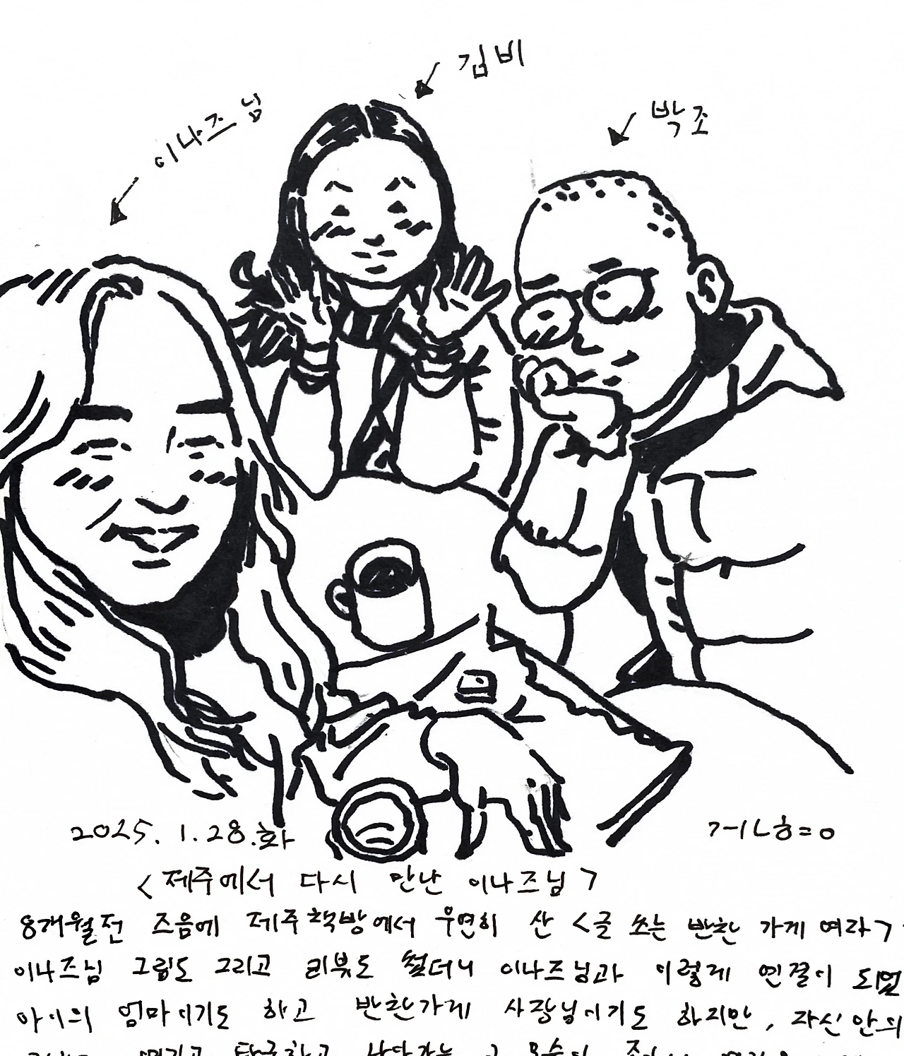 8개월전 즈음에 제주책방에서 우연히 산 <글 쓰는 반찬 가게 여자> 가 좋아서 이나즈님 그림도 그리고 리뷰도 썼더니 이나즈님과 이렇게 연결이 되었다. 두아이의 엄마이기도 하고 반찬가게 사장님이기도 하지만, 자신안의 욕구들을 귀하게 여기고 탐구하고 나아가는 그 모습이 좋아서 연락을 드렸던 것이다. 4개월전에 제주에 왔을때 직접 뵈었고 한라수목원을 같이 산책하기도 했다. 한달에 한번 있는 모임에서 우울증에 대한 이야기를 들려달라고 제주로 초대해 주시기도 했다. 짝지의 책도 구해 읽어보시고, 짝지에게 드리라고 선물도 전해주셨다. 요즘은 반찬가게 2호점을 오픈하셔서 정신없는 하루를 보내고 있음에도 시간을 내어 만나주신다 했다. 혹시 불편하지 않으면 짝지도 같이 보고 싶다고 하셨고, 짝지에게도 그 문자를 보여드렸더니 혼쾌히 같이 만나자고 했다. 같이 밥을 먹고 커피값이 무척 비싼 뷰맛집 카페에서 2시간을 신나게 수다 떨었다. 지금은 반찬가게 운영에 집중하시지만 언젠가 단편소설이든, 에세이든 또 글을 쓰실분 같아 응원을 드렸다. 헤어질때 가게에서 만든 반찬들을 잔뜩 챙겨 주셨다. 인지도 없는 두 작업자를 애정어린 시선으로 응원해 주셔서 참 감사하다.