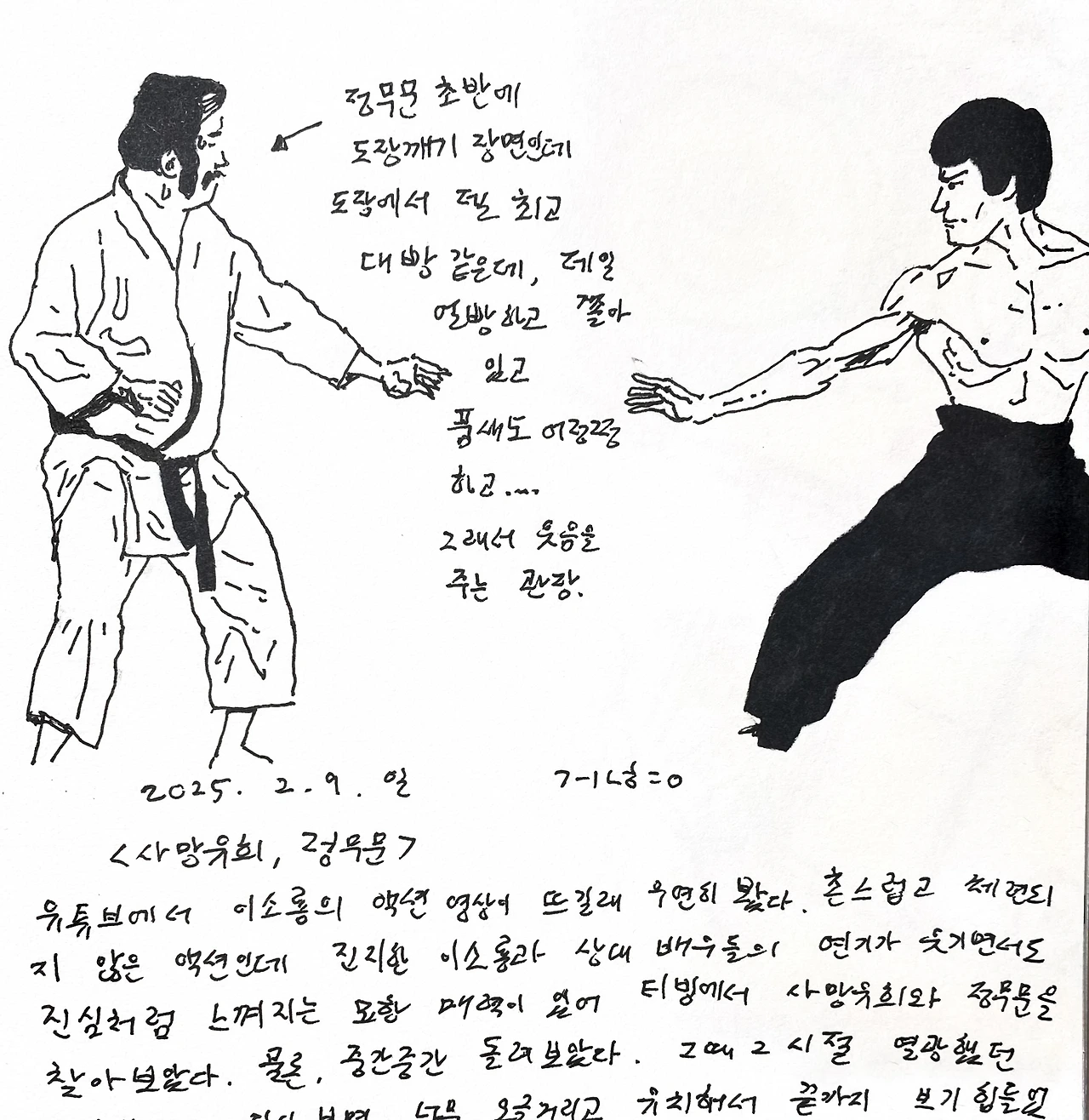 유튜브에서 이소룡의 액션 영상이 뜨길래 우연히 봤다. 촌스럽고 쎄련되지 않은 액션인데 진지한 이소룡과 상대배우들의 연기가 웃기면서도 진심처럼 느껴지는 묘한 매력이 있어 티빙에서 사망유희와 정무문을 찾아보았다. 물론, 중간중간 돌려보았다. 그때그시절 열광했던 영웅본색도 다시 보면 너무 오글거리고 유치해서 끝까지 보기가 힘들었던 것처럼. 사망유희에서 키가 엄청난 악당앞에서 이소룡이 그 거대함을 묘사하기 위해 위를 처다보는데, 마치 상대 악당이 3m가 넘는 것처럼 오바스럽게 연기한다. 정무문에서 일본무도장에서 1대 100대결하는 장면에서 두 일본무사를 들고 뱅글뱅글 도는 장면에선 인형인게 너무 눈에 띈다. 그러나 그 시절엔 그 과장된 액션과 연기가 관객들에겐 멋지고 매력적으로 보였겠지. 촌스럽지만, 그 순간에 집중하는 이소룡의 오바스러운 표정과 기합소리가 묘하게 좋다.