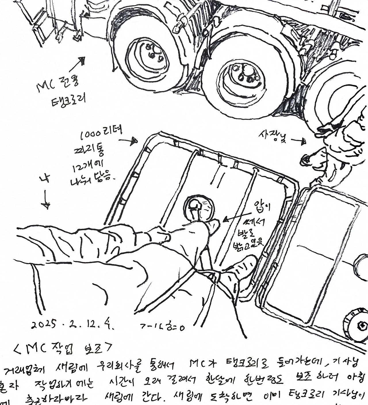 거래업체 새림에 우리회사를 통해서 MC가 탱크로리로 들어가는데, 기사님 혼자 작업하기에는 시간이 오래 걸려서 한달에 한번정도 보조하러 아침에 출근하자마자 새림에 간다. 새림에 도착하면 이미 탱크로리 기사님이 1000리터 토트통에 호스를 연결해 자연으로 받고 있다. 자연으로 받는다 함은 차 펌프로 밀어 넣는게 아니라 낙차로 들어간다는 말이다. 펌프를 돌리면 압이 너무 높아서 나는 토트통에 호스 총을 넣어 발로 밟고 있다. 그래야 12개 작업하는데 30분이 안걸리기 때문이다. MC는 비중이 높은 유해화학물인데 달달한 냄새가 나고 증발이 빨리 되는 제품이다. 작업하며 기사님과 이래저래 수다를 떤다. 회사차인데, 기사들보고 탱크로리를 구입하라고 떠넘긴다고 한다. 가격이라도 싸게 해주면 고민할텐데 말이다. 월급도 몇년째 동결이란다. 대부분의 사업주들은 그렇지 않냐면서 같이 사업주들 욕을 했다. (우리회사는 경기가 안좋아도 월급도 한번도 안밀리고, 매년 최저임금이 오르면 거기에 맞춰 조금씩 올려준다고 자랑아닌 자랑도 슬쩍하긴 했다).