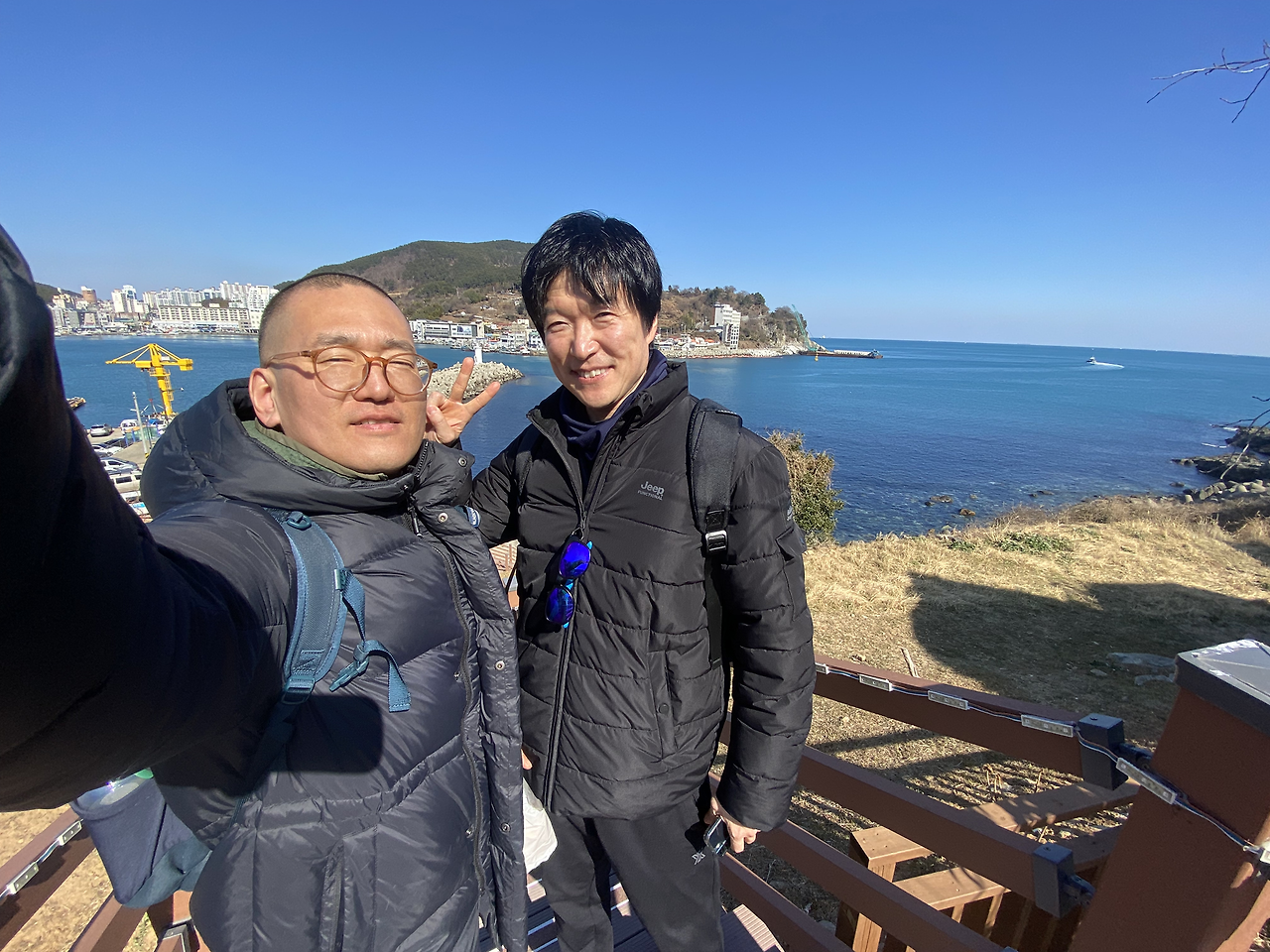 2시간정도 트래킹을 하고 식사를 같이 하고 버스를 타고 이동해 카페에서 1시간 30분을 수다떨었다. 2시간정도 트래킹도 거제에 대해서 곳곳마다 상세히 친절히 설명해주셔서 함께 걷는 시간이 참 좋았다. 원래는 목적지 주변에 맛있는 중국집에서 짬뽕밥을 먹기로 했는데, 전기공사때문에 오픈이 12시로 미루어져 있어서 시간을 보내다가 먹으려다 내가 근처 분식집에서 톳김밥과 라면을 먹자고 해서 그렇게 먹었다. 톳 식감이 강하지 않아서 달달한 양념이 맛있다. 버스를 타기전에 꽈배기로 유명한 맛집에서 대파꽈배기를 먹었는데, 내가 먹은 꽈배기 중에서 젤 마음에 들었다. 대파향이 살짝나고 겉은 가볍게 바삭하고 라이트한 느낌이라 다섯개를 사서 원규쌤 두개 드시고, 내가 세개 먹었다. 식어도 맛있다는 말에, 맛있는 걸 먹으면 짝지가 생각나는 편이라 10개를 현금개산했더니 한개를 서비스 주셨고, 가면서 두개 더 먹었다. 나중에 식어서 먹어도 역시 맛있었다.