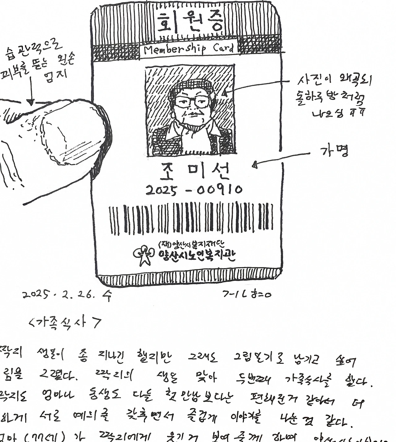 짝지 생일이 좀 지나긴 했지만 그래도 그림일기로 남기고 싶어 그림을 그렸다. 짝지의 생일 맞아 두번째 가족식사를 했다. 짝지도 엄마나 동생도 다들 첫만남보다는 편해진거 같아서 더 친하게 서로 예의를 갖추면서 즐겁게 이야기를 나눈것 같다. 엄마(77세)가 짝지에게 웃긴거 보여줄께 하며 양산시노인복지관에서 만든 회원증 카드를 보여주셨다. 다들 빵빵빵 터졌다. 사진을 이상하게 찍었는지 왜곡이 되어 돌하루방처럼 나온게 아닌가. 첫만남처럼 한우를 맛있게 먹고 내 단골카페인 소소서원에 갔다.첫만남에선 차만마시고 다들 일어나는 분위기여서 이제 입이 풀린 짝지는 무척아쉬워 했었는데 이번에는 서로 편하게 오래 이야기 꽃을 피웠다. 엄마랑 짝지가 둘이 있을때, 엄마가 짝지에게 참 고맙다고 말했다 한다. 왜냐면 우울증으로 오래 힘들어하던 자기 아들이 너무 건강해졌는데 다 짝지가 옆에서 든든하게 있어주었기 때문이라 보셨기 때문이다. 나도 동의한다. 각자 나름 힘들게 살아왔던 구성원들인데 나이가 드니 그래도 조금은 여유로워진 모습들이라 이렇게 함께 이야기 나누는게 참 소중하고 고맙고 행복하다.