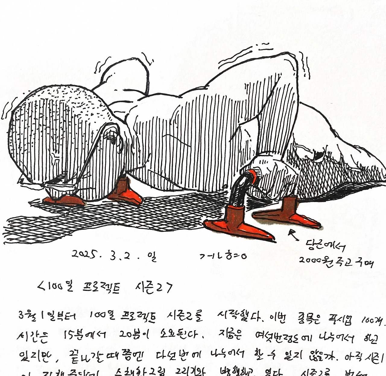 3월1일부터 100일프로젝트 시즌2를 시작했다. 이번 종목은 푸시업 100개. 시간은 15분에서 20분이 소요된다. 지금은 여섯번정도에 나누어서 하고 있지만, 끝나갈때쯤엔 다섯번에 나누어서 할수 있지 않을까. 아직 시즌1이 진행중인데 수채화그림그리기와 병행하고 있다. 시즌2를 벌써 시작한 것은 3월 1일부터 해야 6월 8일에 마무리 되고 본격적인 더위가 시작되기 전에 끝나기 때문이다. 더울땐 특별히 뭘하지 않고 지내는게 최선인거 같다. 시즌1에 스쿼트 100개를 한 선생님이 계셨는데, 75일째쯤 물어보니 체력도 좋아져서 다른 운동까지 포함해 더 하게 되더라하셨다. 이게 100일의 힘이란 말인가 해서 나도 시간이 오래 소요되지 않는 몸을 쓰는걸로 시즌2를 해보기로 했다. 가을에는 시즌3로 스쿼트나 삼두근 운동을 해도 좋을듯 싶다. 나도 2월 15일부터 100개씩 미리 해보았는데, 100일동안 계속하면 가슴이 엄청 펌핑이 될거 같다.