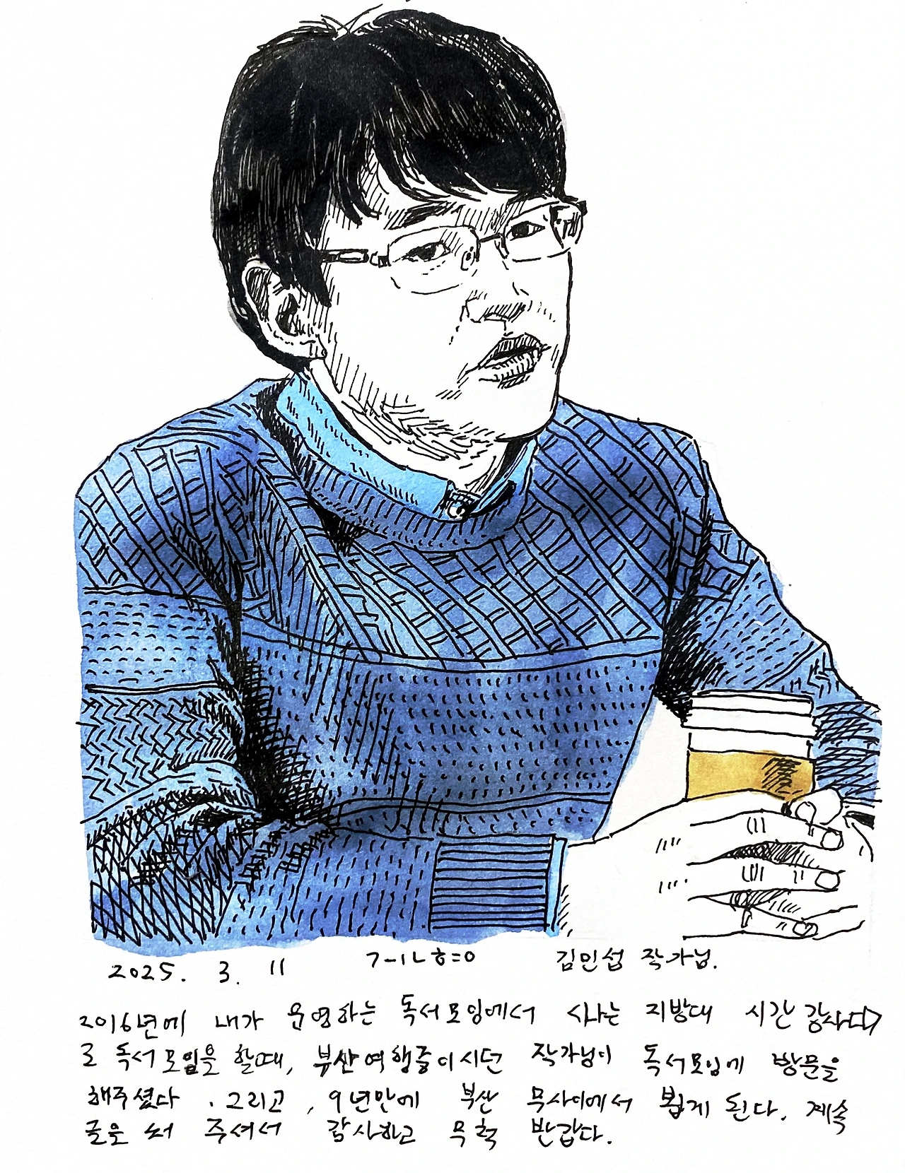 작가님의 책이 좋아서 내가 꾸리던 독서모임에서 시간강사인 친구를 모시고 <나는 지방대 시간강사다>를 읽고 이야기하기로 했었는데, 부산여해중이시던 작가님이 그 모임에 방문을 해주셨다. 시간강사인 친구와 김민섭작가님이 아마 대학교에서 시간강사들의 처우와 현실을 자세히 이야기해 주셨을 것이다.
