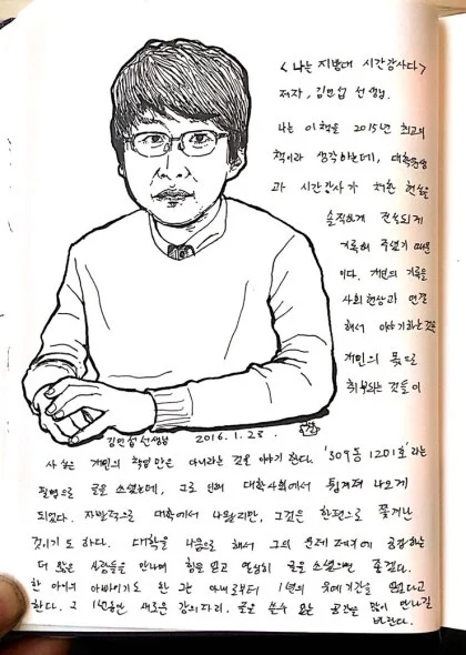 오래전에 부산에서 작가님을 뵌거 같아 내 블로그를 검색하니 흔적이 있었다. 그때도 드로잉노트에 김민섭작가님을 그리고 글을 적은게 있었는데, 나에게 2015년 최고의 책이었던 모양이었다. 아마 책이 좋아서 작가님에게 리뷰를 보냈을 것이고, 좋은 책을 읽은 감사의 의미로 내 독립출판 책 <손그림, 일그림, 삶그림, 계속그림>을 보내드린 모양이다. 연락처도 저장되어 있었다.