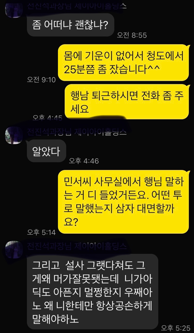 생각해보니 아까 사무실에서 민서씨가 우리 둘이 이야기하는거 다 들었고, 혹시나 싶어서 민서씨에게 전화를 걸어 확인했다. 민서씨는 ”네 그런 투로 말씀하셨죠.“ 했다. 내가 전과장이 내게 그렇게 말 틱틱던지고 나서 민서씨에게 말을 왜 저런식으로 하죠? 하며 투덜투덜했기 때문에 기억이 난다. 내가 전과장에게 아까 민서씨가 사무실에서 이야기 다 들었는데, 삼자대면할까요? 하고 문자 했다.