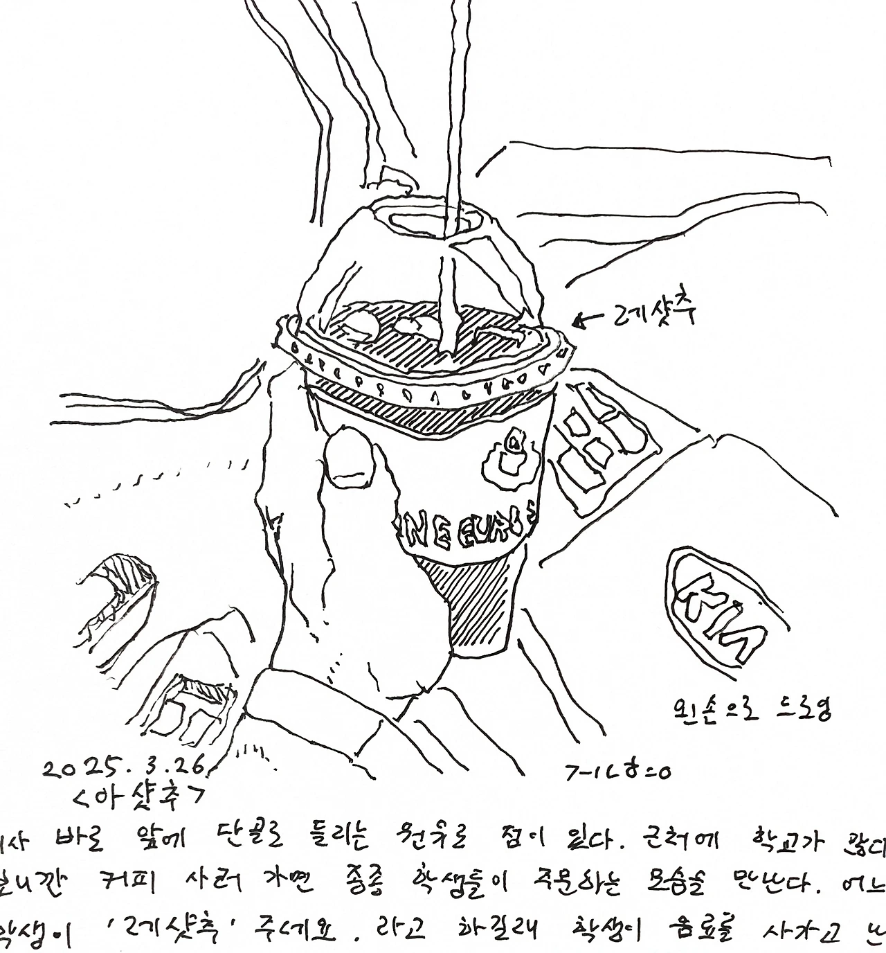 회사 바로 앞에 단골로 들리는 원유로점이 있다. 근처에 학교가 많다보니깐 커피 사러 가면 종종 학생들이 주문하는 모습을 만난다. 어느날 학생이 ‘레샷추’ 주세요. 라고 하길래 학생이 음료를 사가고 난 후 사장님에게 ‘레샷추’가 뭐에요? 물었더니 아이스티에 샷추가를 한게 아샷추라고 했다. 아샷추 입문은 주로 복숭아 아이스티에 샷추가를 한다고 했다. 처음 먹어봤는데, 커피맛을 더 느끼고 싶어서 샷추가 한번더 하니 500원 추가. 이날 복숭아 아이스티에 더블샷 추가, 레몬 아이스티에 더블샷 추가를 먹었더니 커피 네잔을 마신 셈이라 담부터는 그냥 샷추가만 해야될 거 같다. 레샷추는 호불호가 있다고 했는데, 처음에는 맛이 이상한거 같았지만 그 묘한 맛이 매력 있었다. 복숭아랑 레몬이 망고보다는 더 맛있었다. 커피를 좋아해서 카페에 가면 늘 커피만 먹었던게 아니라 입은 축이고 싶은데, 카페에서 제일 싼 메뉴가 아메리카노 였다보니 커피만 먹었는데, 이제는 늘 아샷추만 먹게 될거 같다.