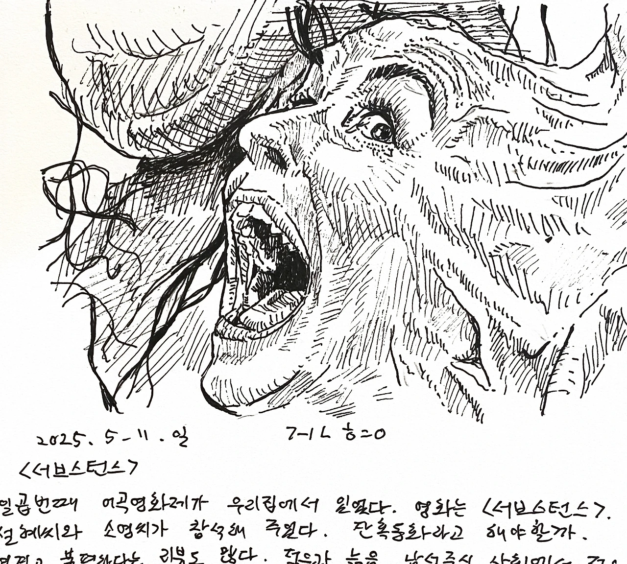 일곱번째 어곡영화제가 우리집에서 있었다. 영화는 <서브스턴스>.설혜씨와 소영씨가 참석해 주었다. 잔혹동화라고 해야할까. 역겹고 불편하다는 리뷰도 많다. 젊음과 늙음, 남성중심사회에서 젊은 여성으로 대상화되어 자본에 의해 소비되는 모습을 적나라하게 그린 영화다. 데비무어가 유명배우로 살아온 삶과 많은 부분 연결되는 영화인데 자신을 던져야만 하는 영화에 출현한 선택이 멋졌다고 생각한다. 후반부에 피칠갑을 한다는 리뷰를 읽었는데, 그 장면을 직접보고 나니 관객인 우리는 박수를 칠 수 밖에 없었다. 성적으로 대상화되며 일상속에서 자주 모욕감을 느끼는 여성들이 그 세상에 대해 분노를 뿜어내는 느낌. 스플래터 무비나 신체가 기괴하게 변형되는 영화가 불편한 분에겐 불쾌한 영화가 될수는 있겠지만, 여성을 늘 몸으로 대상화하고 분절하는 우리 남성중심사회를 오히려 역겹게 느껴야 하는건 아닌가 싶다.