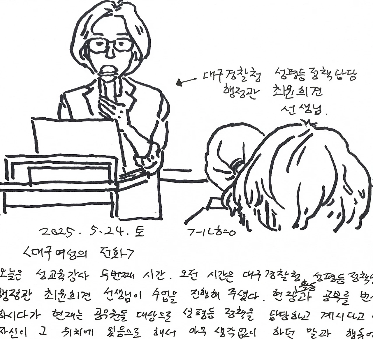 오늘은 성교육강사 두번째 시간. 오전시간은 대구경찰청 성평등정책담당 행정관 최윤희견 선생님이 수업을 진행해 주셨다. 현장활동과 공부를 번갈아 하시다가 현재는 공무원들 대상으로 성평등정책을 담당하고 계시다고 한다. 자신이 그 위치에 있음으로 해서 아무 생각없이 하던 말과 행동에 대해서 강사님에게 물어보게 된다고 하셨다. 한 단체의 장에 어떤 철학을 가진 사람이 있느냐가 그래서 중요한 것 같다. 오전 수업 마지막엔 “서울체크인” 방송의 한 부분을 틀어주셨다. 이효리, 엄정화가 나오는 장면. 요가를 함께하고 난 후의 대화이다. 엄정화가 목수술을 한 적이 있어서 물구나무를 서는 것이 두렵고 겁이 나더라는 말을 하는 장면이었다. 이효리가 자기 몸인데 누가 만져주지도 않는데 내가 잘 만져주고 아껴주어야지 하는데, 엄정화가 울컥했다. 보는 나도 울컥. 대구여성의 전화도 많은 여성들에게 좋은 동료의 역할을 하고 있다고 말씀하셔서 바로 대구여성의전화 정기후원을 했다. 이 성교육강사 과정에 이어서 성폭력상담원, 가정폭력상담원 과정도 이어 듣고 싶은 마음도 생겼다. 대구여성의전화 수업이 강사진도 빵빵하고 배울게 많아서 매주 토요일이 기다려진다.