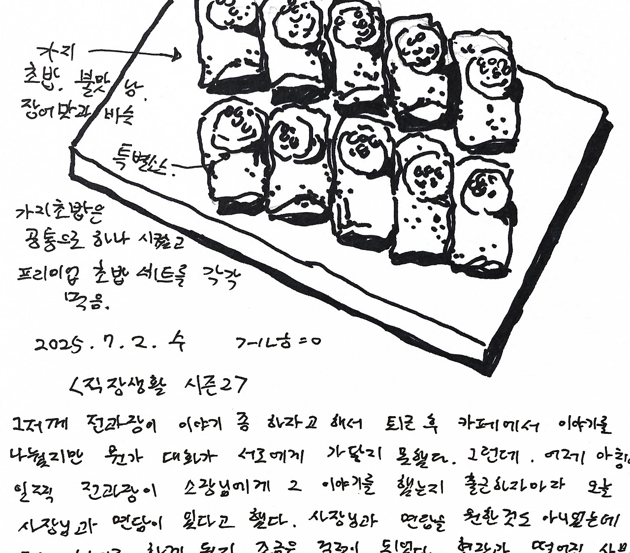그저께 전과장이 이야기 좀 하자고 해서 퇴근 후 카페에서 이야기를 나눴지만 뭔가 대화가 서로에게 가닿지 못했다. 그런데, 어제 아침에 일찍 전과장이 소장님에게 그 이야기를 했는지 출근하자마 소장님이 오늘 사장님과 면담이 있다고 했다. 사장님과 면담을 원한것도 아니었는데 무슨 이야기를 하게 될지 조금은 걱정은 되었다. 현장과 떨어진 사무실에서 사장님과 소장님 나 세명이서 이야기를 나누었다. 사장님은 차분하게 설명을 해주시면서도 직장생활에서의 어떤 한계에 대해서도 분명하게 선을 그어주셨다. 나는 열심히 하려고 한 것 뿐인데 자꾸 충돌이 생기고 거래처에서 문제가 있다는 말이 도는 현실이 조금은 억울하고 서러워서 약간 눈물을 비추기도 했는데, 사장님은 곽휴지를 땡겨주셨다. 면담이 끝나고 내가 뭘좋아하냐고 하셔서 초밥을 먹고 싶다고 했다. 이제 직장생활 시즌2 시작이다. 1. 소장님과 과장님은 사장님에게 신뢰받는 내 상사들이다. 그들에게 뭘 그렇게 대우를 받겠다고 조금만 부당하면 바닥바닥 대들었는지… 그들의 말에 토를 달지 말고 잘 참고 일해야겠다. 2. 김부장이 나를 아니꼽게 보는건 어쩔수 없는 부분이다. 3. 거래처에서 적당한 거리를 유지할 필요가 있다. 4. 권주임 전과장님에게 형님이 아니라 직책 호칭으로 불러야 겠다. 나는 여기에서 일을 해야겠고, 여긴 직장생활이고 나도 조금은 바뀔 필요가 있다. 내가 아무리 열심해 해도 10명중에 2명은 나롤 곡해하고 싫어할수도 있는 것이니 억울해하고 서러워할 필요는 없다. 이제 직장생활 시즌2 시작이다.