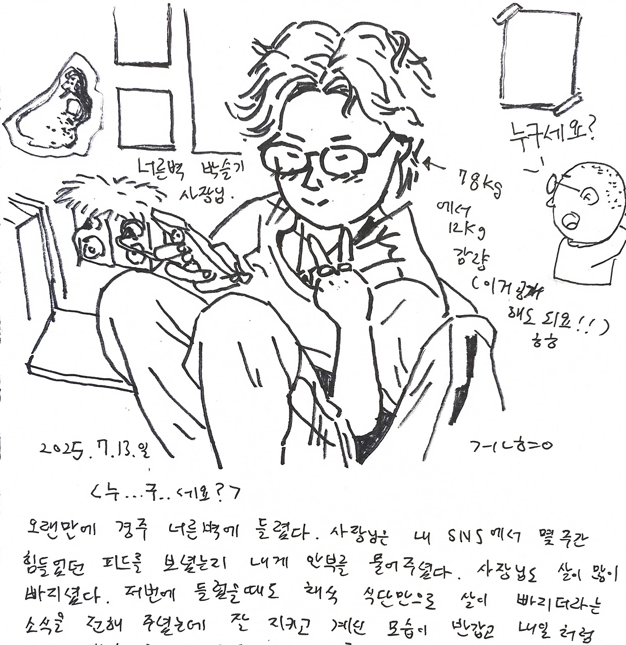 오랜만에 경주 너른벽에 들렸다. 사장님은 내 SNS에서 몇주간 힘들었던 피드를 보셨는지 내게 안부를 물어주셨다. 사장님도 살이 많이 빠지셨다. 저번에 들렀을때도 채식 식단만으로 살이 빠지더라는 소식을 전해 주셨는데 잘 지키고 계신 모습이 반갑고 내일 처럼 기뻤다. 살이 빠진 사람들만이 아는, 몸이 가벼워지니깐 삶이 달라지더라는 이야기를 나누었다. 살이 빠지니 아침에도 일찍 일어나고 피로감도 덜하고 폭식도 덜하게 되고 너무 좋다고 하셨다. 78kg에서 12kg 빠져 현재 66kg이라고 하셨고 65를 목표로 하신다 했다. 체중을 공개하라고 하셨는데, 체중이 있는 사람에게 희망을 주고 싶다며 웃으셨다. 삶에 있어서 건강이 제일 중요하게 여겨질 때가 있게 마련이다.(건강에 관심없는 사람에겐 운동하라는 말을 권하진 않는다) 나도 과체중(87kg) 때문에 더 찌지 않으려고 시작해서 10kg가 빠져서(현 77kg) 3년째 유지가 되고 있고 운동을 가장 생활의 중심으로 놓고 있다. 가을이되면 너른벽 번개로 한번씩 걷기나 등산하자고 제안을 했다.