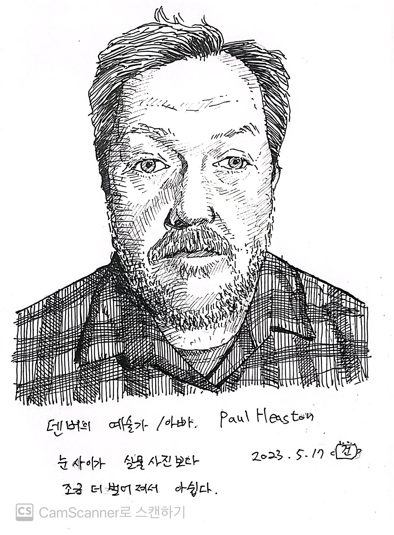 눈이 실물사진보다 조금 멀게그려진 것이 조금은 아쉽다. 그래도 만족한다. 그림 그리는 이 순간이 즐겁기 때문이다. 작가님에게 영어로 번역해 한국의 작은 소도시 양산에 사는 펜드로잉 작가라고 메세지를 드리기도 했다. 응답을 해주시면 큰 영광이리라. ㅎㅎ