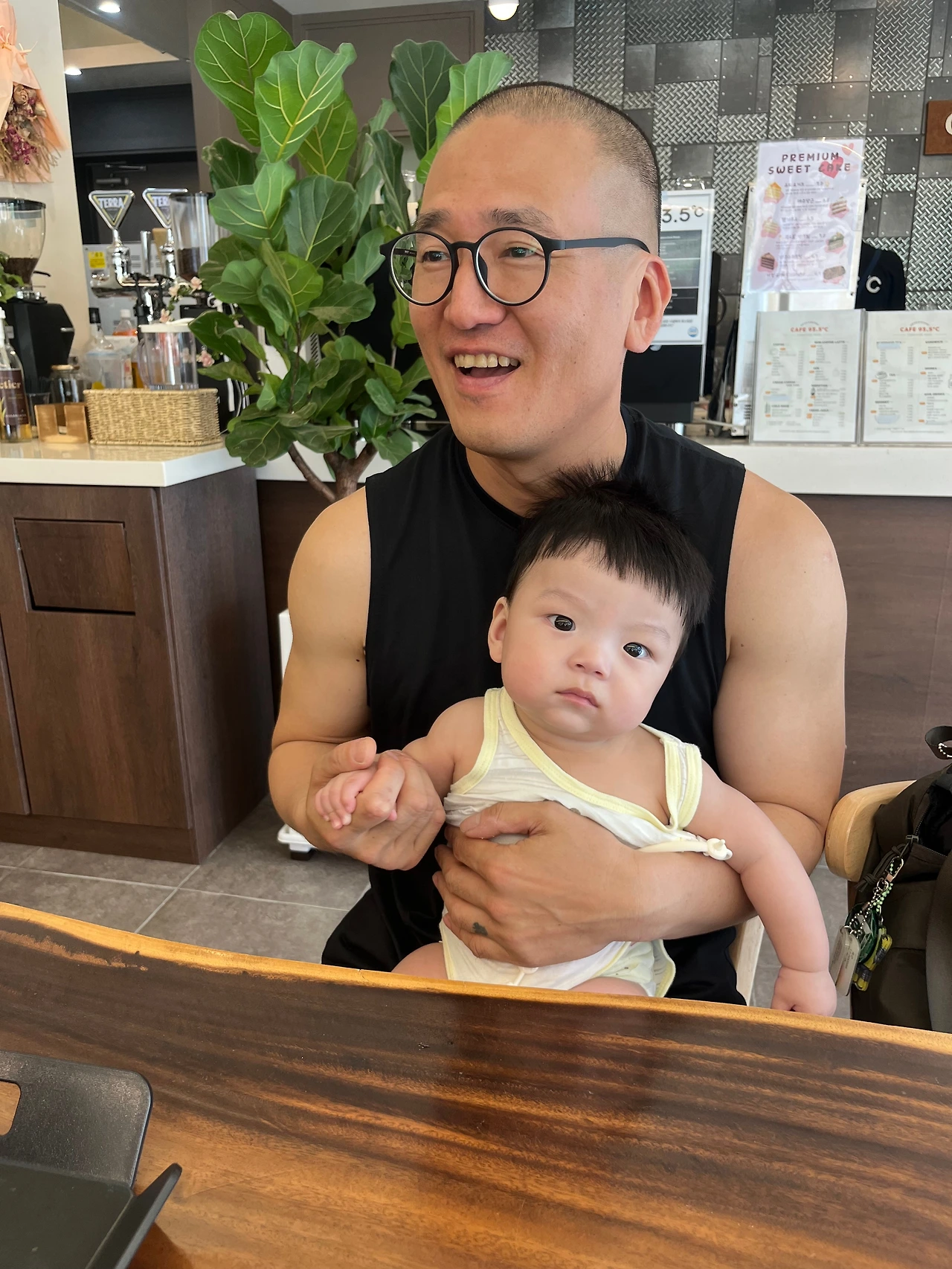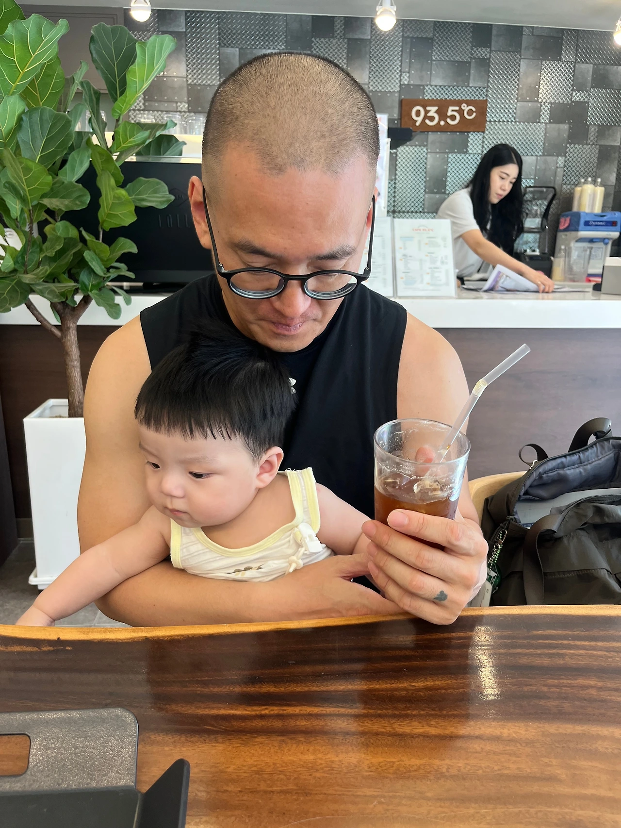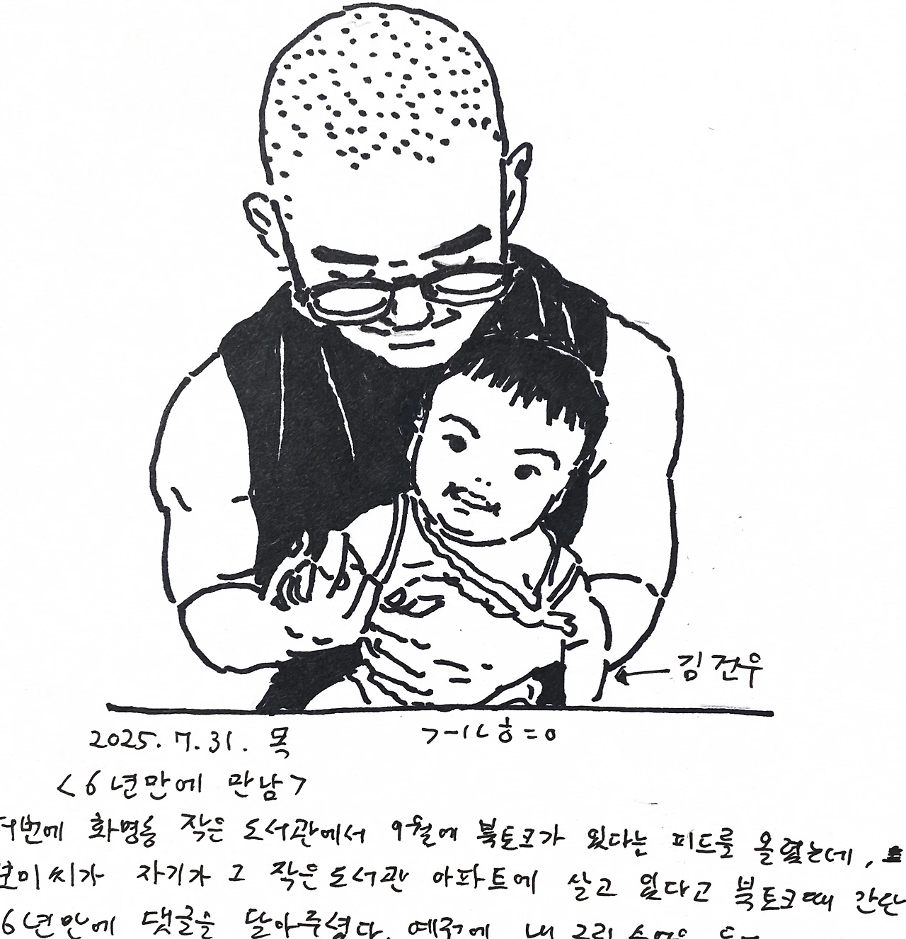 저번에 화명동의 작은도서관에서 9월에 북토크가 있다는 피드를 올렸는데, 보미씨가 자기가 그 작은도서관 아파트에 살고 있다고 북토크때 간다며 6년만에 댓글을 달아주셨다. 예전에 내 그림 수업을 들으셨고 나와 함께 100일드로잉을 한 후 연락이 끊겼었는데 이렇게 연락이 닿았다. 보미씨도 우연하게 마침 그 피드를 보셨다고 했다. 오늘 휴가 마지막날이라 무얼할까 고민하다가 보미씨에게 연락을 드렸는데, 시간이 맞아서 7개월된 김건우를 유모차에 태우고 아파트에서 내려오셨다. 건우가 밖에만 나오면 칭얼대지 않고 조용해서 자주 나오다보니 전에 들렸던 카페에 가자고 하셨다. 건우를 안아봐도 되겠냐고 여쭤보고 내 품에 안았는데 울지 않고 조용히 있었다. 6년간 서로 어떻게 지냈는지 수다를 떨었다. 아파트 젤 윗동에 살고 계셔서 유모차를 아파트 동까지 밀어드리고(상당한 오르막) 다음을 또 기약하고 헤어졌다.