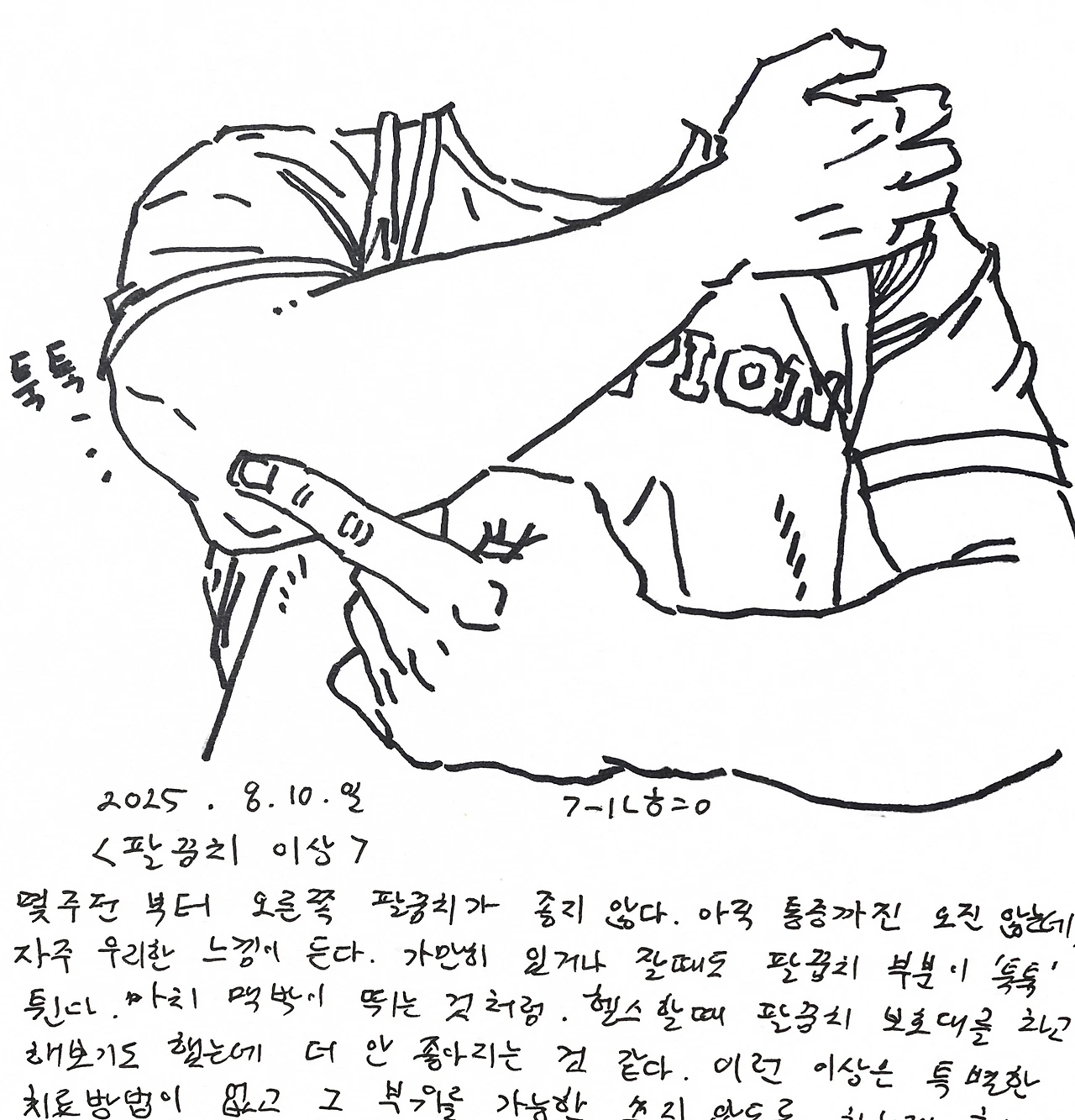 몇주전 부터 오른쪽 팔꿈치가 좋지 않다. 아직 통증까진 오진 않는데, 자주 우리한 느낌이 든다. 가만히 있거나 잘때도 팔꿈치 부분이 ‘툭툭’ 튄다. 마치 맥박이 뛰는 것처럼. 헬스할때 팔꿈치 보호대를 차고 해보기도 했는데 더 안 좋아지는 것 같다. 이런 이상은 특별한 치료방법이 없고 그 부위를 가능한 쓰지 않도록 하는게 최선이라고 하는데. 회사에서 180~220kg 드럼을 땡길때가 있긴 한데 그렇다고 하루종일 드럼만 땡기는건 아닌데 왜 안좋은건지 모르겠다.(짝지는 당신도 내년이면 50이니 그럴수 있다고 말하긴 하는데, 나이가 들어서 그런건가….) 일단 회사에서 드럼땡길때도 가능한한 왼쪽을 쓰거나 양손을 써서 땡기고, 헬스장에서도 유산소와 복근 하체만 당분간 해야겠다. 근육이라는게 몇주 안하면 금방 없어지는거라 2년 반동안 성실히 해서 만들어 놓은 상체 근육이 사라질까봐 괜히 침울한 이번 주 였다.