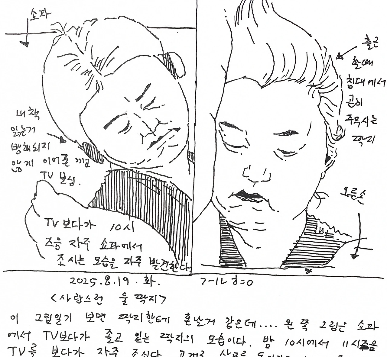 이 그림일기 보면 짝지한테 혼날거 같은데…..왼쪽 그림은 쇼파에서 TV보다가 졸고 있는 짝지의 모습이다. 밤 10시에서 11시즈음 TV를 보다가 자주 조신다. 고개로 상모를 돌리기도 하고 졸다가 안 존 것처럼 눈을 뜨고 다시 TV를 보신다. 할머니나 엄마가 조는 모습만 보다가 짝지 조는 모습을 자주 보니 ㅋㅋㅋ 웃기고 귀엽다. 조는 모습을 여러번 동영상으로 찍어서 소장도 하고 있다. 오른쪽 그림은 출근할때 침대에서 팔을 베고 자는 모습. 출근할때 잠에서 깨서 침대에서 바이바이 할때도 있지만, 그림처럼 곤히 자고 있을때도 있다. 그럴때 잠시 짝지 얼굴을 한참 보다가 갈때가 있다. 짝지는 화내겠지만, 나는 그냥 이런 모습들이 귀엽고 사랑스럽다.