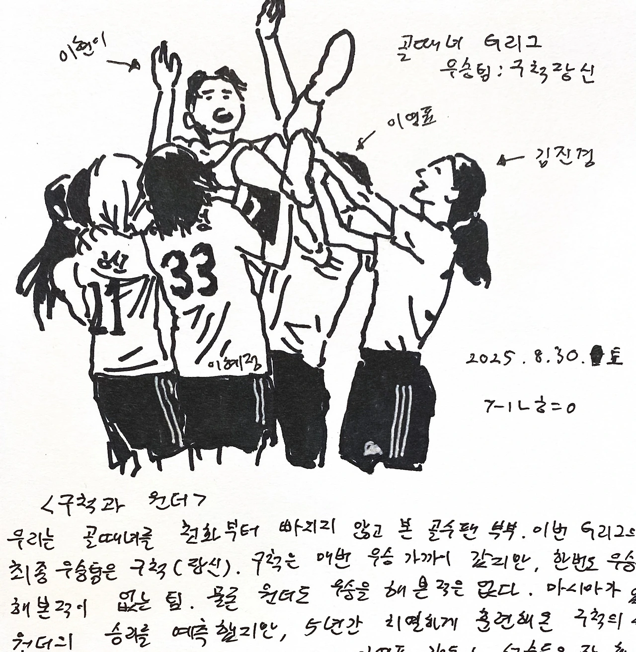 우리는 골때녀를 첫화부터 빠지지 않고 본 골수팬 부부. 이번 G리그의 최종 우승팀은 구척. 구척은 매번 우승가까이 갔지만, 한번도 우승을 해본적이 없는 팀. 물론 원더도 우승을 해본 적은 없다. 마시마가 있어서 원더의 승리를 예측했지만, 5년간 치열하게 훈련해온 구척의 성실함과 노력이 결실을 맺은 셈이다. 이영표감독이 선수들을 잘 활용하고 훈련시킨 결과인 거 같다. 마지막 휘슬이 울리고 이현이는 결국 울음을 터트렸다. 남편이 축구선수라 그런지 김진경의 활약이 돋보였고, 골롱도르를 수상했다. 허경희의 활약도 무시못하고, 마시마를 전담마크한 차서린도 성실했다. 농구를 했던 이혜정은 스크린을 너무 잘한다. 이제 단판경기로 승부를 내는 지파컵이 열리고 지금 팀체제의 마지막이 될지 모른다고 한다. 지파컵이 끝나고 골때녀는 또 어떻게 개편될까? 늘 기대하고 보는 골때녀다.