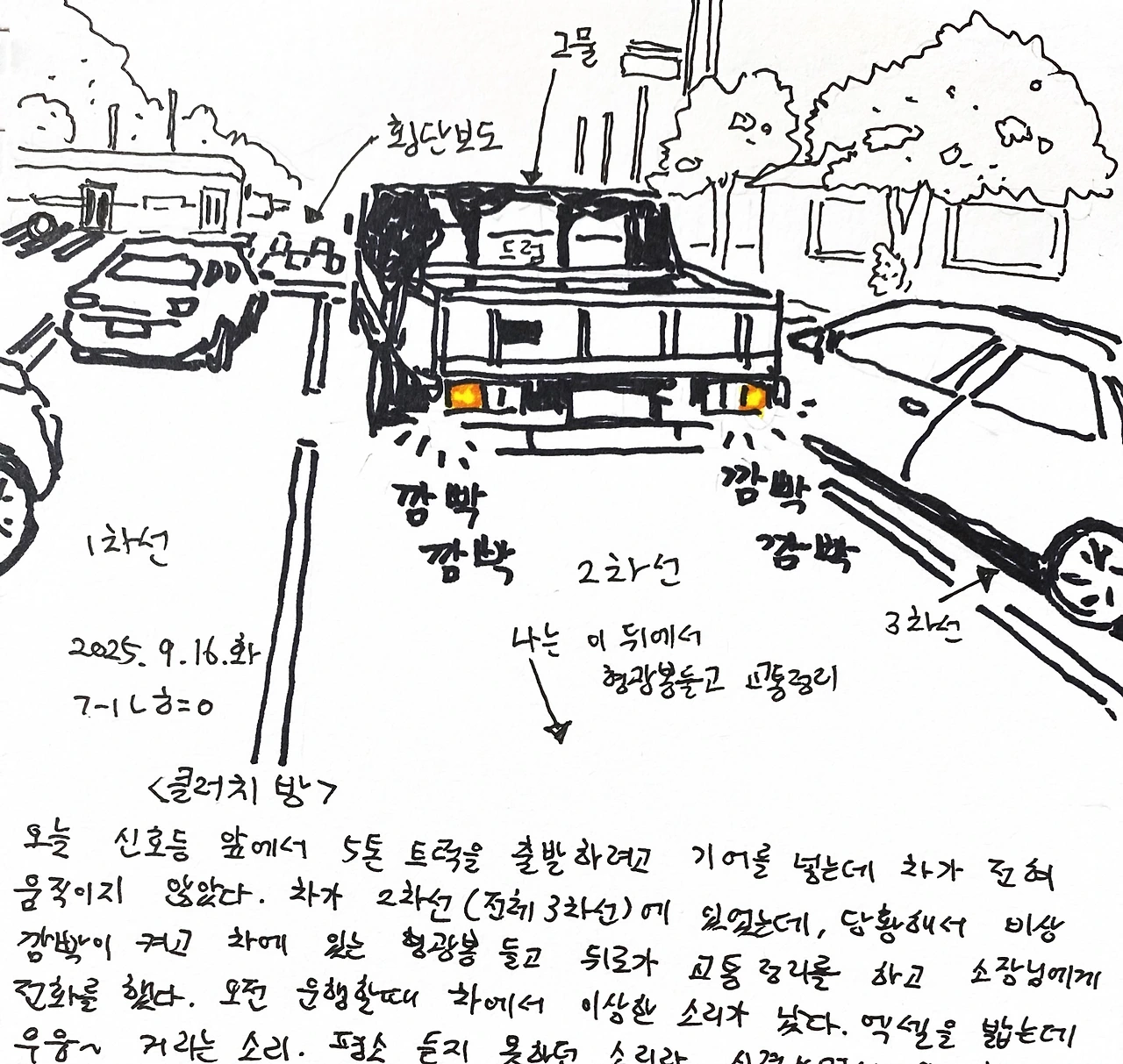 오늘 신호등 앞에서 5톤 트럭을 출발하려고 기어를 넣는데 차가 전혀 움직이지 않았다. 차가 2차선(전체 3차선)에 있었는데 당황해서 비상깜빡이 켜고 차에 있는 형광봉 들고 뒤로가 교통정리를 하고 소장님에게 전화를 했다. 오전 운행할때 차에서 이상한 소리가 났다. 엑셀을 밟는데 우웅~ 거리는 소리. 평소 듣지 못하던 소리라 신경쓰면서 운전했다. 그런데 차는 점점 힘을 내지 못하고 12:40에 차가 서버렸고 클러치방이 나간 것이었다. 회사 보험에 전화해서 견인차 부르고 차장님에게 전화오고 전과장에게 전화오고 형광봉 들고 50분은 흔들다보니 힘들었다. 날씨는 더워서 땀이 주루룩. 차에 3.5톤 정도 짐이 실려 있다 했더니 그정도는 정비소에서 작업할수 있다고 해서 견인해서 정비소에 맡겼다. 짐이 없으면 10km까지 무료인데 짐이 있어 10만원을 내야 견인 가능하다 했다. 밥도 못먹고 있다가 3시 넘어 간단히 배를 채웠다. 다행히 퇴근 5시전에 클러치방 교체가 되어서 차를 찾아올 수 있었다. 부품값 65만원 공임비 32만원(부가세 별도). 운전할때 도로위에 서서 비상깜빡이 켜고 있는 대형차들을 종종 봤는데 그게 내가 될 줄은 몰랐다. 신호대기 중에 움직이지 않아서 그나마 다행이다 싶다. 큰 경험했다.