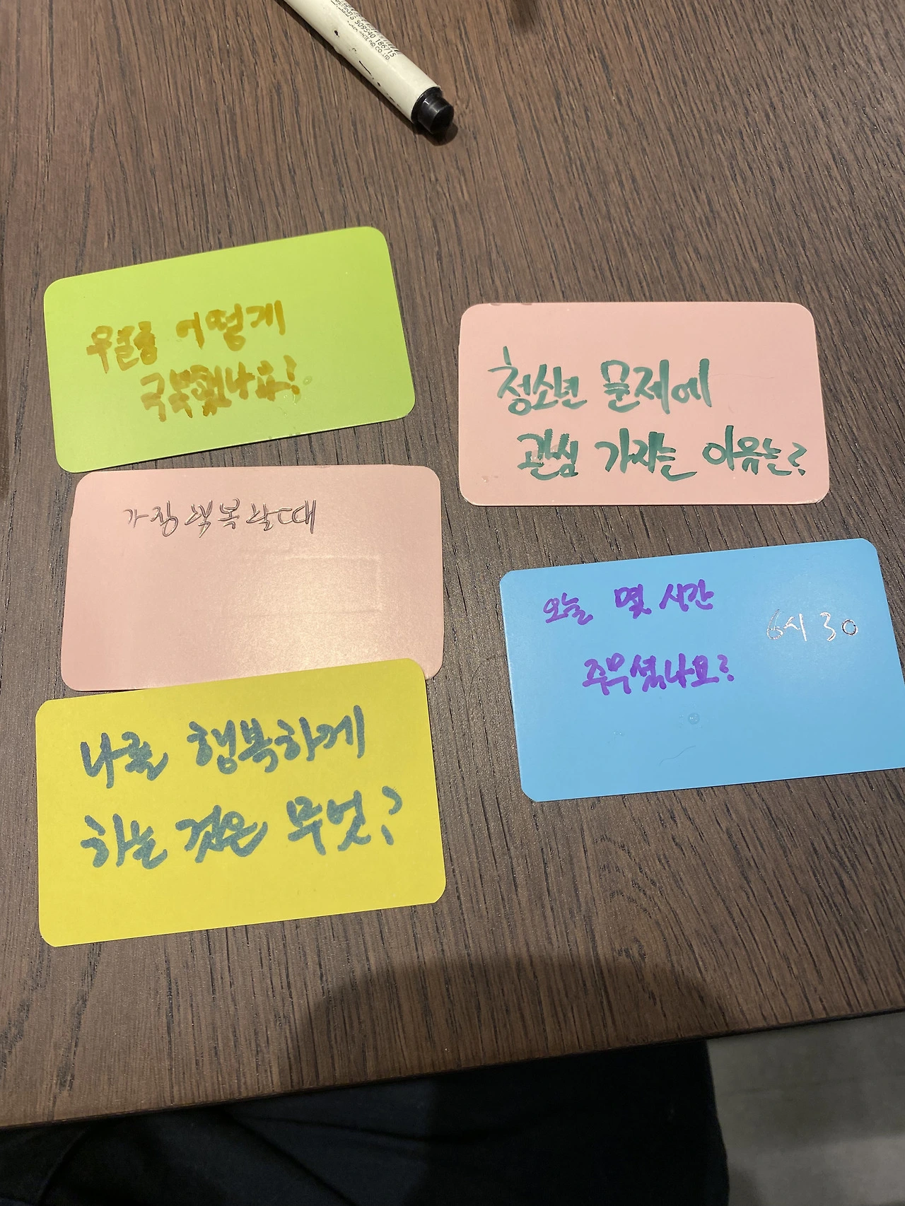 어제 나빼고 참여자가 다섯명이라 다섯장의 종이에 각각의 인물에게 하고 싶은 질문을 적어서 그 분에게 드렸다. 다섯명이 내게 준 질문으로 2분동안 말했다. 상대로부터 대화를 이끌어 내려면 단답형의 질문은 피하는게 좋다.