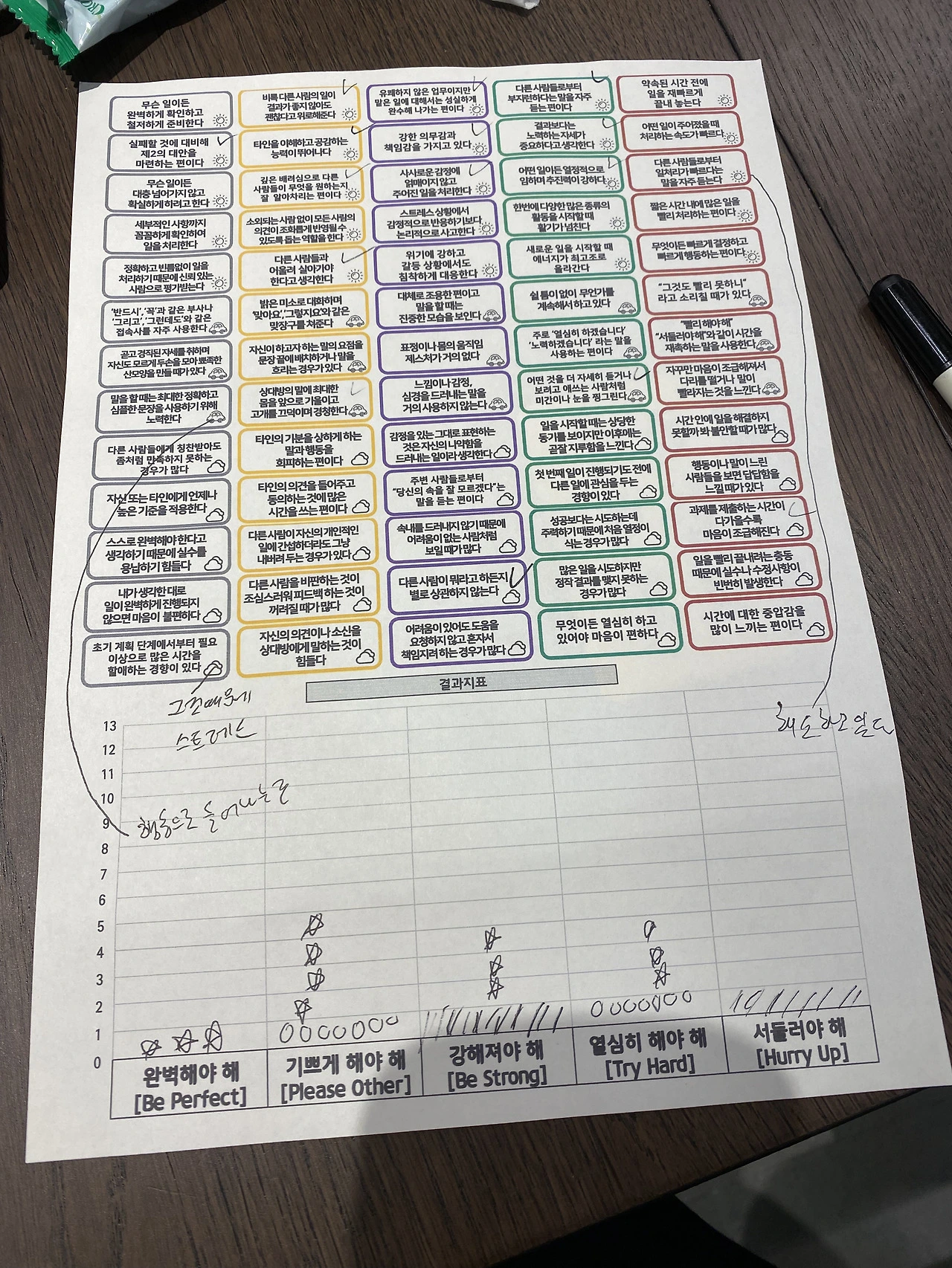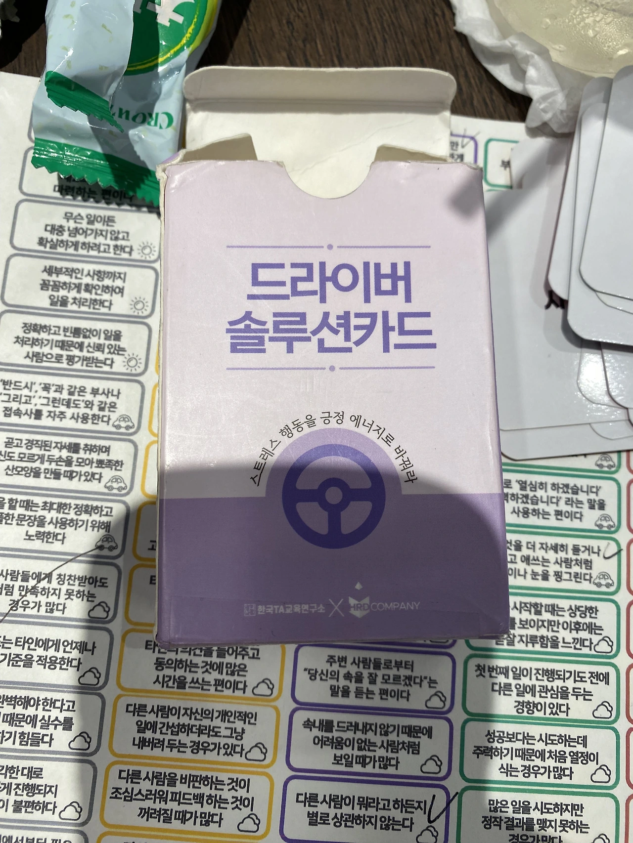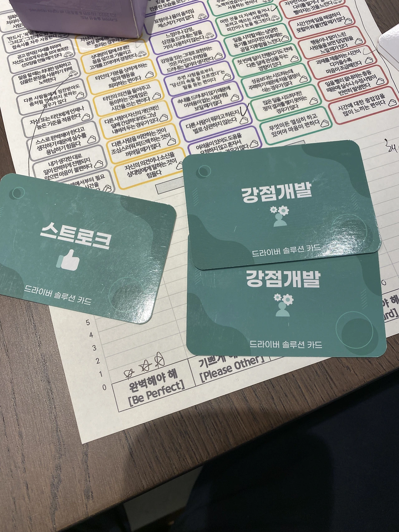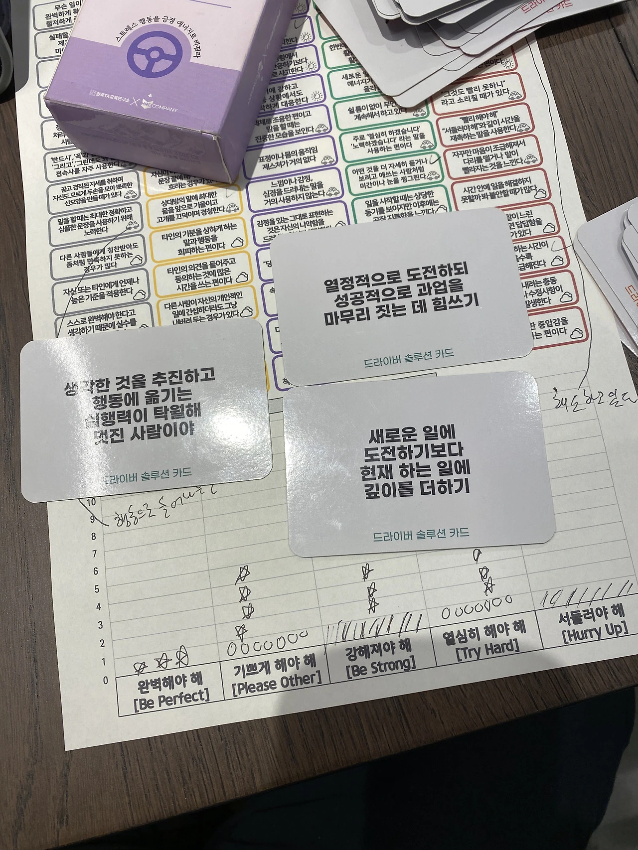 그리고 마지막으로 참여자 모두에게 “드라이버 솔루션카드”를 주셨다. 카드에는 문장들이 있는데 내가 듣고 싶은 카드들을 골라보라고 하셨고, 최종적으로 세장만 골라 보라고 하셨다. 이 문장들은 내가 요즘 듣고 싶은 말인데, 스스로 내게 이 문장들을 자주 읽어주면 내 삶이 응원받는 느낌이 든다 했다. 원래는 그 카드에 적힌 문장을 참여자들이 모두 돌아가면서 카드의 주인에게 이야기를 해주는데, 어제는 시간이 없어서 옆 짝꿍이 한번만 이야기를 들려주었다.