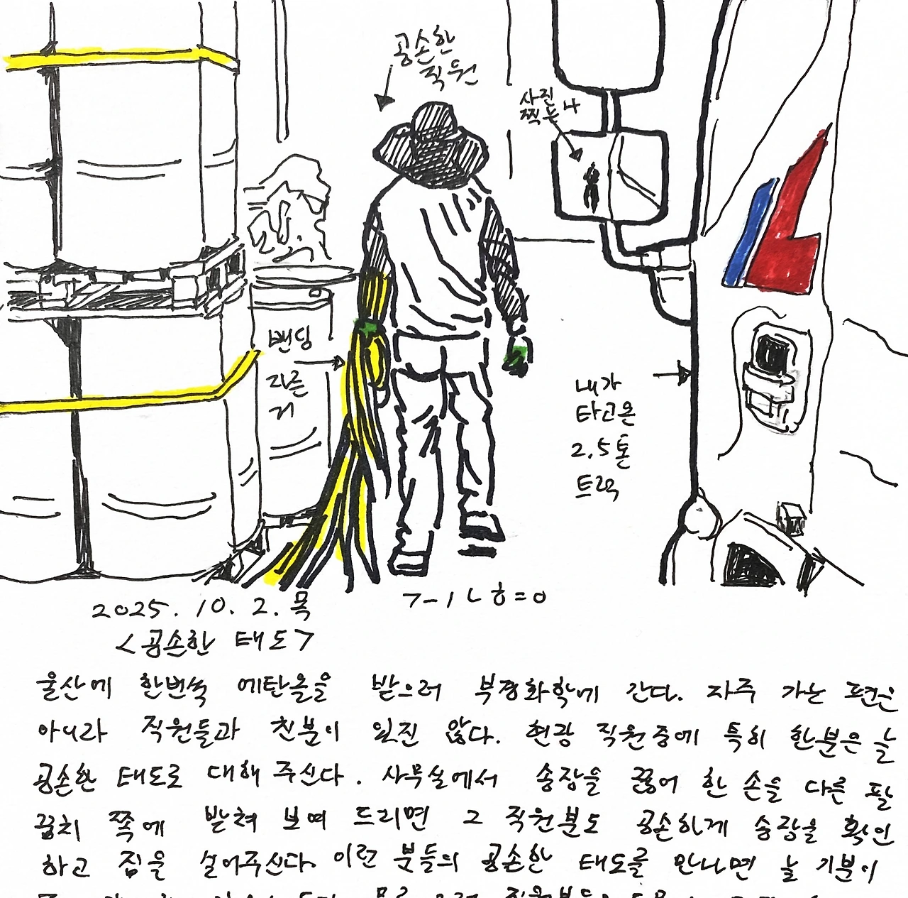 울산에 한번씩 에탄올을 받으러 부경화학에 간다. 자주 가는 편은 아니라 직원들과 친분이 있진 않다. 현장 직원중에 특히 한분은 늘 공손한 태도로 대해 주신다. 사무실에서 송장을 끊어 한 손을 다른 팔꿈치 쪽에 받쳐 보여드리면 그 직원분도 공손하게 송장을 확인하고 짐을 실어주신다. 이런 분들의 공손한 태도를 만나면 늘 기분이 좋고 감사한 마음이 든다. 물론 그런 직원분들은 드물다. 무뚝한 사람은 영원히 무뚝뚝하고 무례한 사람은 늘 무례하다. 나도 거래처 현장에 가면 기분좋게 말을 건낸다. 긴 여름이 가고 가을이 왔을때, ”긴 여름 동안 고생 많으셨습니다~“ 하고 너스레를 떨면 다들 웃으며 좋아하신다. 다른 거래처에서 차를 후진으로 넣으려고 하는데 택배차가 짐 다섯개만 금방 내리면 된다고 하셔서 먼저 들어가라 했다. 일을 도와 드리며, “추석전이라 일이 많으시지요?” 말을 건네니 고개를 끄덕끄덕 하셨다.(그 택배 기사님은 그날 처음 봤다) 타인을 공손하게 대하는 태도는 삶을 살아가는데 중요한 능력이라고 생각한다.