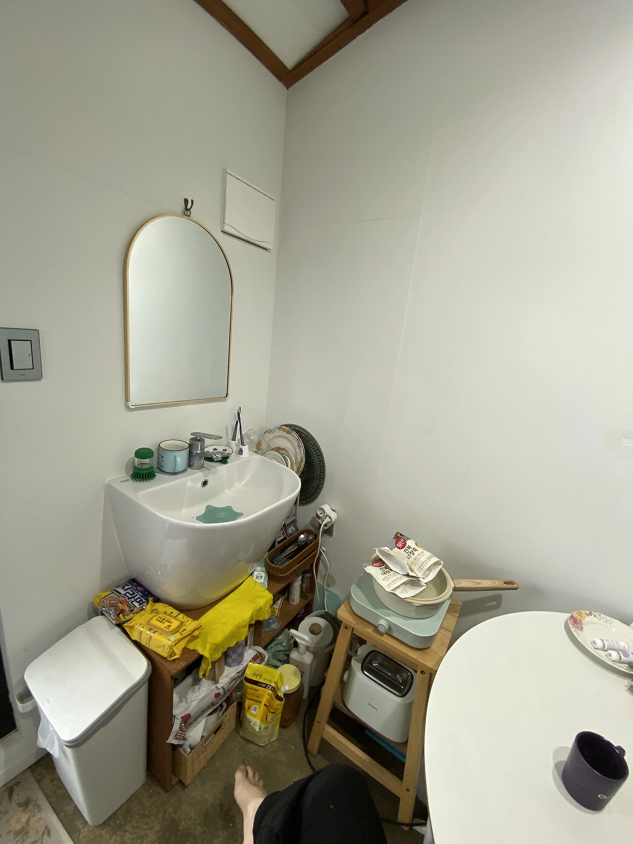 제주에 가면 장모님댁 보일러실을 리모델링한 원룸같은 작업실에 지낸다. 입구 바로 옆에는 개수대가 있다. 개수대 위에 거울이 있고, 개수대 윗면에 짝지랑 나의 칫솔이 꽂혀 있다. 음식물이 개수대를 막으면 답이 없으니 개수대 내려가는 곳에는 실리콘 망이 있어서 설겆이를 하면 항상 그 실리콘 망 위에 음식찌꺼기들을 닦아 낸다. 개수대가 좁다보니 음식을 먹으면 바로바로 그릇을 씻고 물기를 하나하나 털어 원래 있던 자리에 넣어둔다. 개수대 앞 의자 위에는 전기 인덕션이 있다. 장모님이 해주시는 밥은 상에 들고 와서 먹고, 다 먹은 후에는 본체 부엌에서 설겆이를 한다. 원룸크기 방이라 음식을 다양하게 해먹기는 어렵다. 그래도 따로 우리끼리 뭘 먹을수 있으니 하루 세끼 장모님이 챙겨주시는 밥을 안 먹어서 좋고, 장모님도 신경 안쓰시니 좋다.(우리부부는 아침은 간단히 먹는 편이고 한끼 정도만 든든히 먹는다) 짝지는 자다가 본체 화장실 가기가 번거로워 휴대용으로 옮길수 있는 소변통을 방안에 두고 한밤중에만 활용한다. 나는 한밤중에도 본체 화장실을 이용한다.