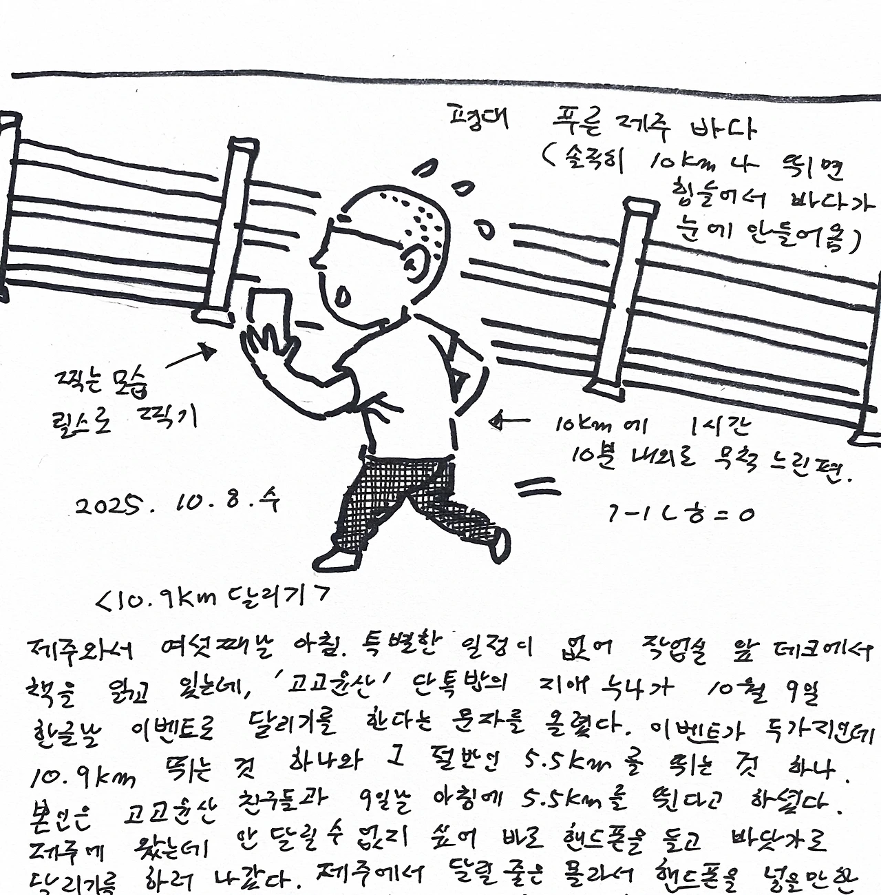 제주와서 여섯째날 아침. 특별한 일정이 없어 작업실 앞 데크에서 책을 읽고 있는데, ‘고고윤산’ 단톡방의 지애누나가 10월 9일 한글날 이벤트로 달리기를 한다는 문자를 올렸다. 이벤트가 두가지인데 10.9km 뛰는 것 하나와 그 절반인 5.5km를 뛰는 것 하나. 본인은 고고윤산 친구들과 9일날 5.5km를 뛴다고 하셨다. 제주에 왔는데 안 달릴수 없지 싶어 바로 핸드폰을 들고 바닷가로 달리기를 하러 나갔다. 제주에서 달릴 줄은 몰라서 핸드폰을 넣을만한 가방을 챙겨오지 않았다. 손에 들고 달리니 땀이 차서 왼손에 들었다 오른손에 들었다 불편하긴 했다. 처음부터 10.9km를 뛸 생각은 아니었는데 뛰다보니 뛸수는 있을 거 같아 끝까지 완주했다. 11시에 아점을 먹기로 해서 그 시간에 맞출수 있다 생각했는데 집에 가는 길에 골목하나를 잘못 들어가서 한참 헤매다가 결국 11시 넘어 도착했다. 짝지에게 혼날까봐 서둘러 뛰어갔는데, 기왕 식은 밥 샤워하고 먹자고 하셨다. 한글날 이벤트 완료!! 10.94km, 1시간 17분.
