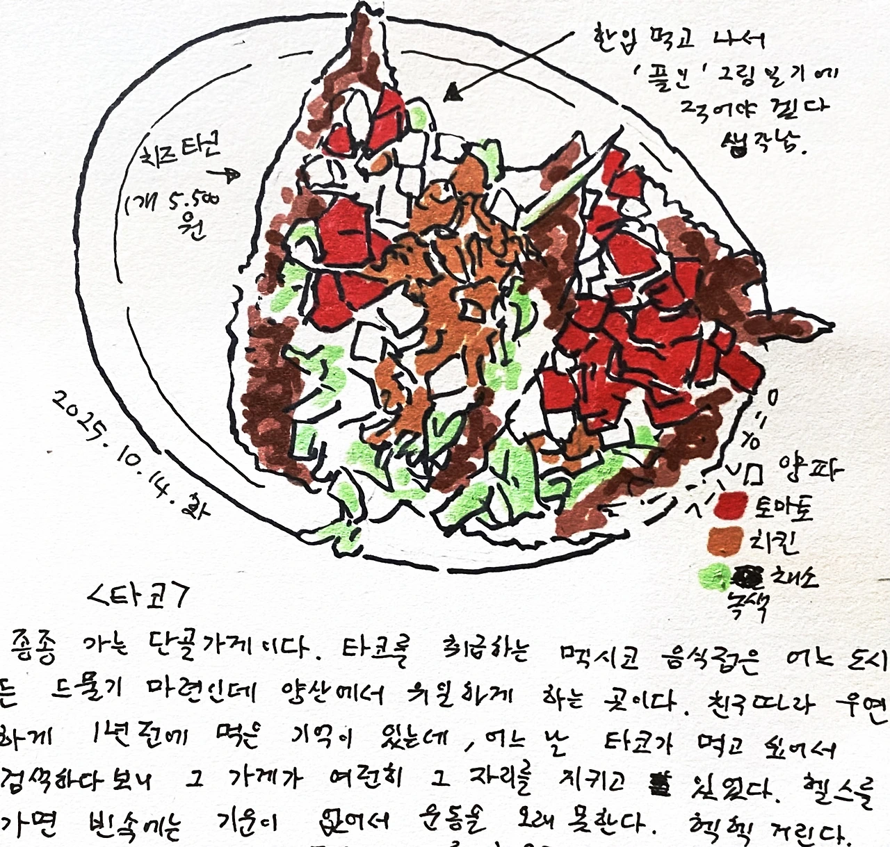 종종 가는 단골가게이다. 타코를 취급하는 멕시코 음식점은 어느 도시든 드물기 마련인데 양산에서 유일하게 하는 곳이다. 친구따라 우연하게 1년전에 먹은 기억이 있는데, 어느 날 타코가 먹고 싶어서 검색하다보니 그 가게가 여전히 그 자리를 지키고 있었다. 헬스를 가면 빈속에는 기운이 없어서 운동을 오래 못한다. 헥헥 거린다. 그래서 운동가기전에 무엇이든 배를 채우고 가고 2~3주에 한번정도는 타코를 먹으러 ‘플인’에 간다. 나는 늘 먹는 것만 먹는 사람이라 가면 치즈타코 두개를 시켜 먹는다. 치미창가나 퀘사디아도 먹어보긴 했는데, 나는 치즈타코만 먹는다. 쉬림프가 들어간 것과 치킨 들어간 것이 있는데 쉬림프를 그다지 좋아하지 않아 치킨들어간 치즈타코만 먹는다. 자주 가다보니 사장님이 어느날은 사이다를 서비스로 주시기도 했다. 주말에는 사람들이 많이 와서 알바를 세명이나 쓰시더라.(평일에는 혼자 일하시고 가게도 작음) 늘 반겨 주시는 사장님의 이야기가 궁금해서 다음에 한번 인터뷰 요청을 해 보려고 한다. 뭐 싫다고 하시면 안하면 되고.