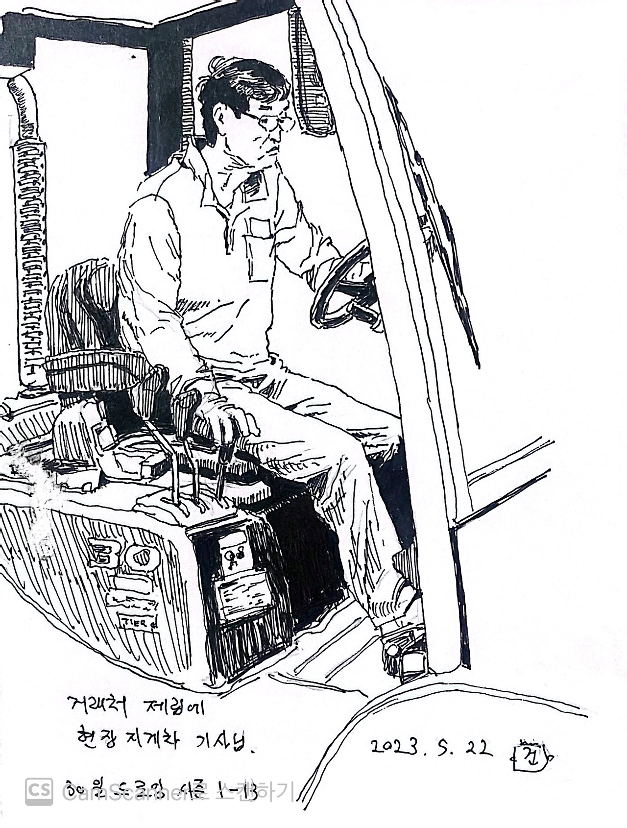 그림에 있는 지게차 모는 아저씨는 양산 통도사 근처에 있는 회사직원이다. 여기 현장에는 지게차 기사가 두명인데, 한명은 아주 무뚝묵하고 뚱한 표정을 늘 짓고 있고, 이 그림의 주인공은 성질머리가 지랄같다. 그런데, 나는 매번 갈때마다 싹싹하게 인사하고 일처리를 신속하게 하니 부딪힐 일이 없게된다. 이런 경우에는 가까운 관계까지는 가지 못하지만, 그래도 최소한 일은 능률적으로 하게 된다.