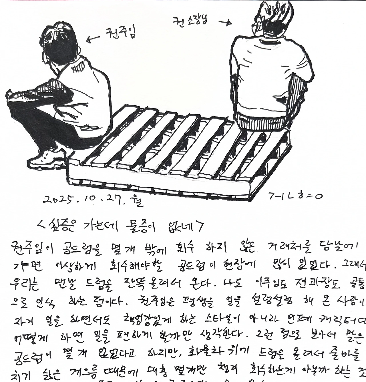 권주임이 공드럼을 몇개 밖에 회수 하지 않은 거래처를 담날에 가면 이상하게 회수해야할 공드럼이 현장에 많이 있었다. 그래서 우리는 맨날 드럼을 잔뜩올려서 온다. 나도 이주임도 전과장도 공통적으로 인식하는 점이다. 권주임은 평생을 일을 설렁설렁 해 온 사람이고 자기 일을 하면서도 책임감있게 하는 스타일이 아니라 민폐 캐릭터다. 어떻게 하면 일을 편하게 할까만 생각한다. 그런점으로 보아서 말은 공드럼이 몇개 없었다고 하지만, 화물차위에 드럼을 올려서 줄바를 치기 싫은 게으름때문에 대충 몇개만 챙겨 회수하는게 아닐까 하는 것이 우리의 심증이다. 물증이 없는데, 권주임에게 뭐라 할수도 없고, 물증없이 말해봐야 아니다라고 화만 낼게 분명하다. 전과장은 권주임을 무지무지 싫어하는데(나도 예전에 그랬었다), 물증만 잡히면 아침 회의 시간에 소장님과 권주임 앞에서 분명하게 말할거라고 했다. 우리 세명이 공통적으로 하는 말은 권주임이 나가는것 말고는 답이 없네 이다. 술먹고 지각을 하거나 술취해서 출근한적이 있는데, 소장님도 한번만 더 그러면 일 못한다는 말을 우리 앞에서 했기에 우리는 권주임을 내 보내야 한다고 주장할듯 싶다. 소장님은 일도 못하고 요령만 피우는 권주임을 왜 커버쳐주고 쉬운일만 배차하는지 이해를 할 수가 없다. 본인은 늘 중립이고 배차를 공평히 한다고 말하긴 한다.