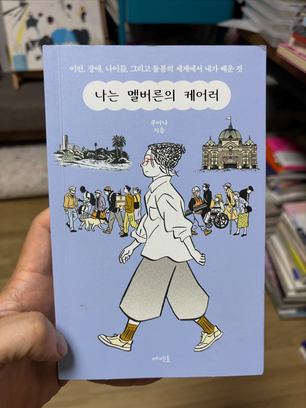 부제는 이민, 장애, 나이듦, 그리고 돌봄의 세계에서 내가 배운 것이다. 한국에서는 교사셨고 , 현재는 호주에서 살고 계시며 요양보호사와 장애인지원사 일을 하고 계신다. 신경 다양인 아들이 태어나면서 돌봄과 장애 분야에 관심이 생기셨다고 한다. 여기서 “신경다양인”이라는 개념이 나오는데, 발달장애나 자페를 장애의 시선에서 보는 것이 아니라 다양성의 개념으로 인식하는 것이다. 예를 들어 휠체어를 탄 사람이 2층 식당에 가지 못하면 한국에서는 자신의 장애를 탓하지만, 휠체어 이용자가 갈수 있도록 만들지 않은 가게와 그것에 대한 배려나 정책이 없는 한국사회의 문화를 문제시 삼으면 개인의 문제가 아니라는 것과 같다. 그러니깐 발달장애인이나 자폐인, ADHD가 있는 사람을 기존사회에 녹여 사회성을 키우도록만 교육할 것이 아니라, 비장애인들은 그들과 어떤식으로 소통할지 고민하고 그들의 사고로 대화하는 것도 공부해야한다고 말한다.
