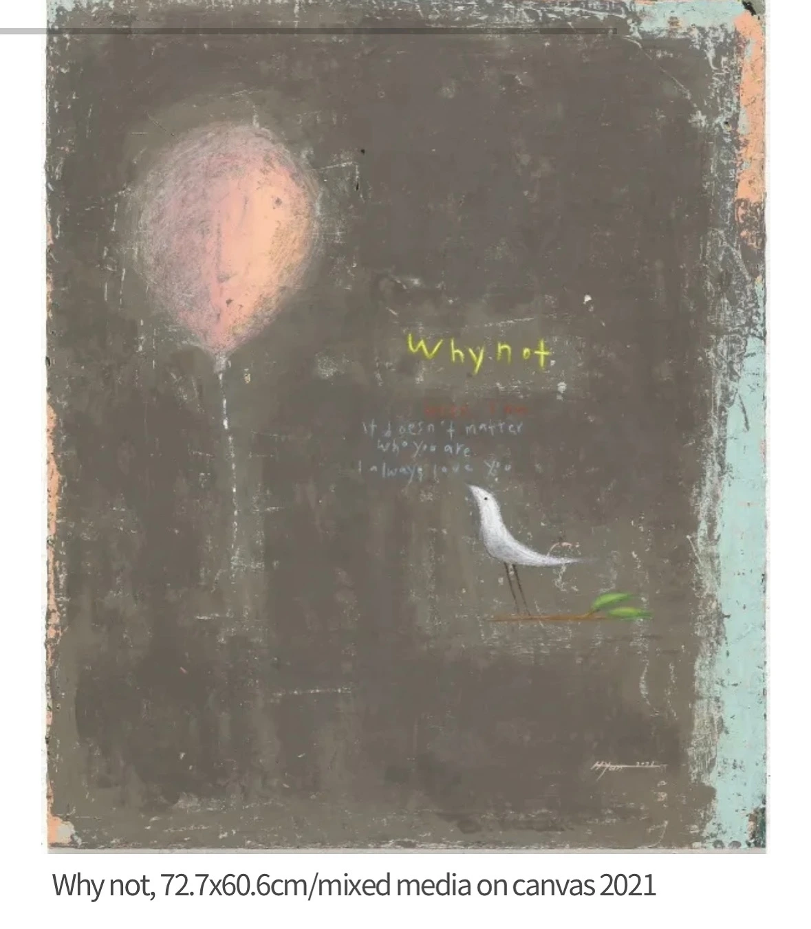 왼쪽에 풍선이 있다. 쭈글쭈글 무표정한 얼굴의 풍선이다. 그외에는 다 암흑. 무기력하고 무표정한 풍선. 제 색깔이 없는 풍선이다. 오른쪽 옆의 하얀새가 풍선에게 묻는다. Why not? 왜 안돼? 무기력속에 잠식한 사람에겐 그 말이 메아리 처럼 들리고 튕겨 나갈 것이다. 하얀새는 그래도 옆에 있는다. 그리고 하얀새는 작지만, 자기 색깔, 자기 철학이 분명한 새이다. Why not? 이라는 질문이 풍선에게는 가닿지 않으리라는 걸 하얀새도 잘 안다. 그래도 그렇게 묻는다. 거리감을 두고 옆에 있는다. 그 질문을 할 뿐이다. 괜찮아 괜찮아 다독이는 것도 아니고 존재로서 그냥 옆에 있는다. 어쩌면 그런태도가 차갑게 보일수도 있지만, 하얀새는 풍선 옆에서 따뜻함과 냉철함 중간의 위치에서 이야기 한다. 풍선이 어떤 색깔을 가졌는지 우리는 알수 없다. 분명 자기의 이야기가 있을 것이다. 그것이 있다라는 것을 하얀새는 안다. 그래서 묻는 것이다. 넌 분명 네 색깔을 찾을 것이라고. 풍선이 그렇게 자기 색깔을 찾을지 바람이 실실 빠져 형체없이 흐물흐물해 질지는 아무도 모른다. 그만큼 무기력한 풍선이 자기 색깔을 찾는 일이 쉽지 않고 지난하고 안될수도 있다는 사실을 말하고 있다. 문제는, 여기서 중요한 것은 믿음의 영역으로 넘어간다는 것이다.