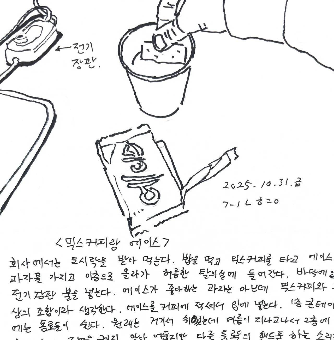 회사에서는 도시락을 받아 먹는다. 밥을 먹고 믹스커피를 타고 에이스 과자를 가지고 이층으로 올라가 허름한 탈의실에 들어간다. 바닥에 있는 전기 장판 불을 넣는다. 에이스가 좋아하는 과자는 아닌데 믹스커피와 환상의 조합이라 생각한다. 에이스를 커피에 적셔서 입에 넣는다. 1층 콘테이너에는 동료들이 쉰다. 원래는 거기서 쉬었는데 여름이 지나고 나서 2층에 가서 혼자 쉰다. 조명을 켜지 않아 어둡지만 다른 동료들의 핸드폰 하는 소리가(크진 않지만) 눈을 붙이는데는 시끄러운 편이다. 여름엔 에어콘 때문에 같이 있었을 뿐이다. 날씨가 선선해지고 짧게라도 책을 읽어볼 요량으로 아침에 차에서 내릴때 읽을 책이랑 노안용 안경을 챙겨 가지만 밥을 먹고 난 후의 45~50분이란 시간이 짧다. 5분정도는 양치해야해서 누워서 쉬다가 5분일찍 일어난다. 어쩔땐 20분 가량 책을 읽고 눕지만, 대부분은 그냥 핸드폰 조금 하다가 20~30분정도 꿀잠을 잔다. 책은 챙겨만 가고 안 읽고 도로 가져갈때가 많다. 눈만 감고 있을때도 있고, 잠시 잠이 들기도 한다. 육체노동일을 하니 점심때라도 눕는게 큰 휴식이 된다. #그림일기