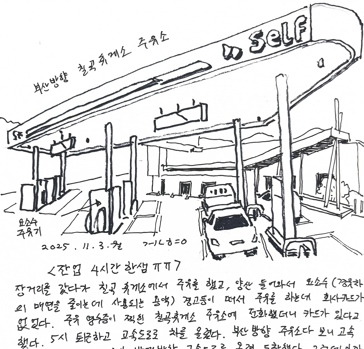 장거리를 갔다가 칠곡휴게소에서 주유를 했고, 양산 들어와서 요소수(경유차의 매연을 줄이는데 사용되는 용액) 경고등이 떠서 주유를 하는데 회사카드가 없었다. 주유영수증이 찍힌 칠곡휴게소 주유소에 전화했더니 카드가 있다고 했다. 5시 퇴근하고 고속도로로 차를 올렸다. 부산방향 주유소다 보니 고속도로에서 내려 다시 반대방향 고속도로를 올려 도착했다. 그런데, 아까 낮에 주유했던 곳이 아니지 않는가. 아 맞다 칠곡이었지!!!(내가 도착한 곳은 청도휴게소였다) 다시 밀양까지 내려와 다시 고속도로 올렸다가 남구미에서 내리고 다시 고속도로를 올려 부산방향 칠곡휴게소에 도착했다. 바로 칠곡휴게소로 출발했다면 3시간 걸리지 않게 집에 왔을텐데, 돌고돌아 오는 바람에 집에오니 밤 9시였다. 실수는 어쩔수 없고, 회사카드를 찾았으니 다행이고 그림일기 소재꺼리 생겼다고 생각하며 운전했다. 낮에도 장거리를 뛰느라 오래 운전한데다가 4시간을 더 운전한 셈이니 집에 오자마자 샤워하고 골아떨어졌다.