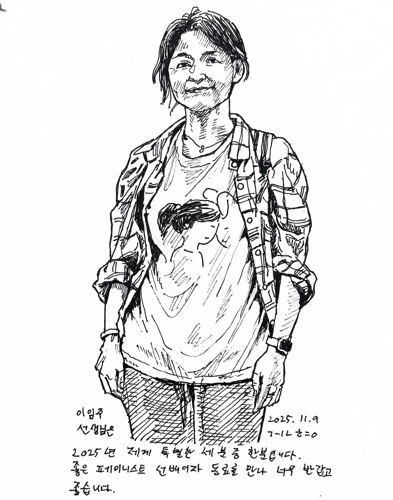 연말마다 나에게 특별한 세명에게 선물을 하고 약속을 잡아 밥한끼 대접하는 일은 선물을 주는 나도 기분 좋고 받는 분들도 기분좋은 이벤트라서 많은 이들에게 권해보고 싶다. 주는 나도 받는 나도 부담되지 않는 선물을 주거나 밥을사고 차한잔 하며 수다 떠는 시간을 가지는 건 참 기분 좋은 일이다. 제주에 갈일이 없어서 올해가 가기 전에 이임주 선생님을 뵙지는 못하지만, 그림으로나마 선물을 드린다. 한국사회에서 페미니스트 라는 말을 꺼내기가 쉽지 않기에 페미니스트 동료들을 만나면 무척반갑고 귀하다. 대안학교에서 정규과목의 하나로 페미니즘 과목을 넣어 매주 학생들과 만나고 계시다. 한국사회에서 너무 특별한 실천이 아닌가 싶다.
