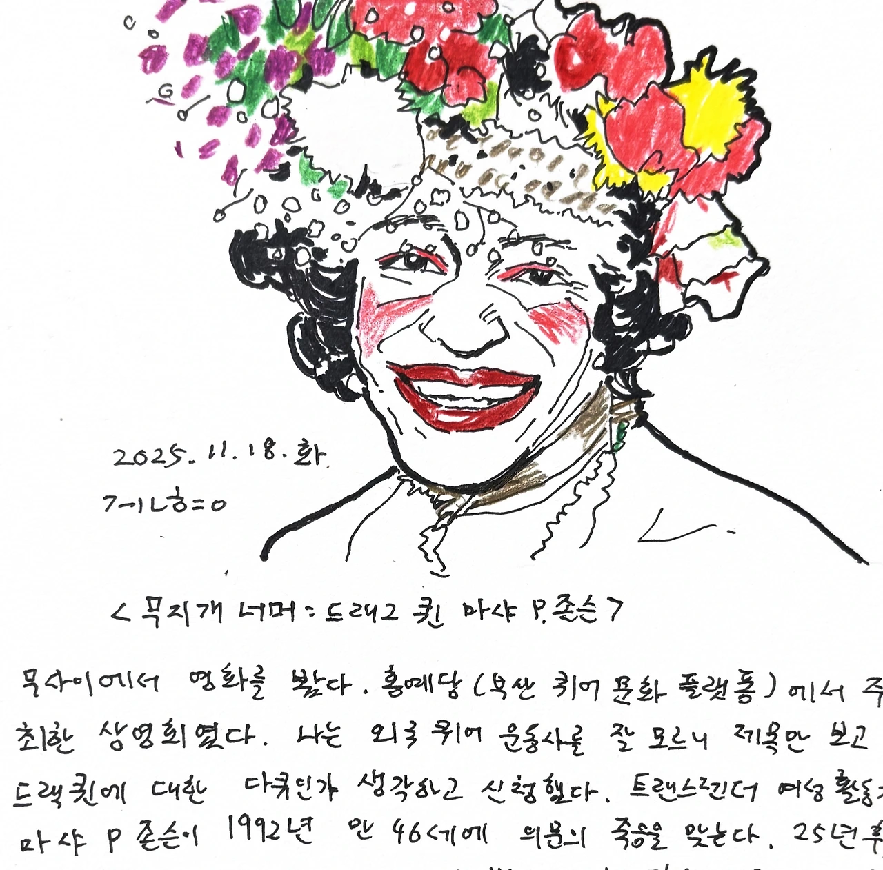 무사이에서 영화를 봤다. 홍예당(부산 퀴어 문화 플랫폼)에서 주최한 상영회였다. 나는 외국 퀴어 운동사를 잘 모르니 제목만 보고 드랙퀸에 대한 다큐인가 생각하고 신청했다. 트랜스젠더 여성 활동가 마샤 P 존슨이 1992년 만 46세에 의문의 죽음을 맞는다. 25년후, 반성폭력 운동가인 트랜스젠더 여성 빅토리아가 자신이 은퇴하기 전에 그 죽음의 미스테리를 풀기 위해 조사하는 과정을 영화 내내 쫓는다. 계급문제, 인종문제, 퀴어문제가 교차성을 갖고 얽힌다. 그때도 지금도 트랜스젠더 여성들이 살해당하는 현실은 그대로이고 경찰들도 침묵한다. 트랜스젠더들은 게이, 레즈비언 커뮤니티에서도 늘 소외되고 배제되는 현실을 보여주고 있었다. 회사에서 일이 힘들었는지 영화 중간에 잠시 졸았다. 영화가 끝나고 10분정도 돌아가며 감상평을 짧게 이야기 했는데, 앨라이인 나와는 달리 오신 분들이 모두 퀴어 당사자들이라 그런지 영화를 나보다 더 가슴아프게 감상하신 것 같아서 그 이야기를 듣는 시간이 귀중하고 좋았다.