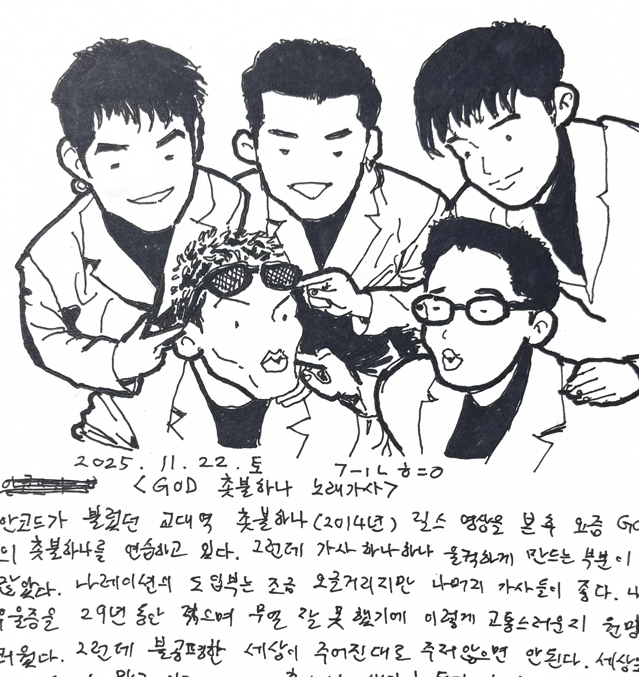 안코드가 불렀던 교대역 촛불하나(2014년) 릴스 영상을 본 후 요즘 GOD의 촛불하나를 연습하고 있다. 그런데 가사 하나하나 울컥하게 만드는 부분이 많았다. 나레이션의 도입부는 조금 오글거리지만 나머지 가사들이 좋다. 나도 우울증을 29년 동안 겪으며 무얼 잘못했기에 이렇게 고통스러운지 원망스러웠다. 그런데 불공평한 세상이 주어진대로 주저않으면 안된다. 세상앞에 고개 숙이지 말고 기죽지 마라. 혼자라는 생각이 들지 않게 내가 너의 손잡아 주고, 촛불 하나가 또 두개가 되고, 세 개, 네개가 된다는 메세지. 물론 이 가사를 각자도생의 자기극복이라고 해석하고 싶지는 않다. 세상이 부조리하다고 해서 원망만 하지 말고 나아가자는 메세지. 그리고 혼자가 아니고 우리가 옆에 있겠다는 가사에 연습할때마다 펑펑 눈물이 터져 흘렀다. 랩이 길어 이 노래는 생각도 하지 않았는데, 가사가 너무 와닿아서 그리고 사람들에게도 힘이 될 수 있는 노래이고 흥겨운 노래라 무한정 수백번 반복 연습해봐야겠다. 그리고 사람들앞에서 또 불러봐야지.