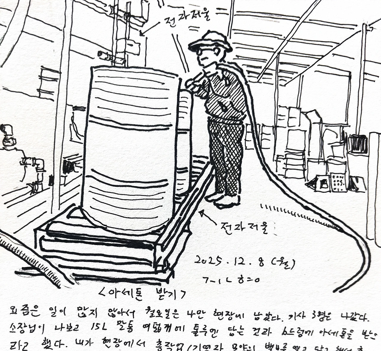 요즘은 일이 많지 않아서 월요일은 나만 현장에 남았다. 기사 3명은 나갔다. 소장님이 나보고 15L 말통 여덟개에 톨루엔 담는 것과 b드럼에 아세톤을 받으라고 했다. 내가 현장에서 총작업(기역자 모양의 밸브를 열고 닫고 해서 총쏜다고 말한다)을 하는 모습이 좀 멋진거 같아(한 사람 몫을 잘하는 것 같아) 그림일기로 남겨야지 해서 큰 선풍기 기둥에 핸드폰을 기대 동영상 촬영을 했고 그 동영상 중 하나를 캡쳐해서 그렸다. 내가 총쏘는 역할을 알아서 하니 소장님은 뒤에서 지게차 타고 다른 일을 편하게 할수 있다. 총쏘는건 나랑 전과장만 할 줄 안다. 어려운 일은 아닌데, 자주 반복적으로 해야 금방 익히는 일이라 전과장과 나만 할 줄 안다. 물론 배관을 잘못 연결하거나 실수를 하면 큰일이 나기에 신중하게 확인하고 해야하는 일이라서 일이 익을때까지 매번 긴장을 했다. 대부분 바깥으로 납품하러 다니니 이 총쏘는 일을 익힐 시간이 충분치 않아 늘 어렵게 느꼈던 것이다. 회사에서 한사람 이상의 몫을 충실히 하는 나, 좀 멋지다. #그림일기