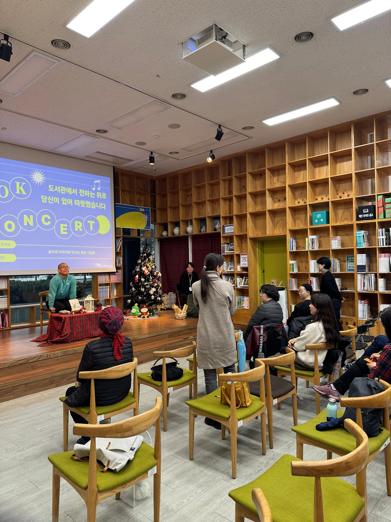 북토크는 참 좋았다. 북토크 전에 김빛날윤미님의 바이올린 공연이 있었다. 나도 대기실에서 연주하는 걸 감상했다. 7살 5살 자녀가 있다고 하셨는데, 자녀들과 함께 오신 모양이었다. 원래 세곡을 준비하셨는데, 반응이 좋아서 객석에서 앵콜요청에 한곡 더 연주하셨다. 도서관 직원들이 기획을 꼼꼼히 해주시고 직원들도 함께 오셔서 많이 들어주셨다. 앞에 윤미님 공연시간이 생각보다는 길어서 내가 너무 길게 이야기 할 필요는 없을것 같아 이야기는 조금 줄였다. 50분정도 강연후 입장하실때 나눠드린 메모지에 자신에게 좋은 사람 한분을 제게 소개해달라며 종이 적는 시간을 5분 정도 가졌다. 몇일 전 부산 미우서재에서 김달님 북토크때 작가님이 10분정도 참여자들이 종이에 글을 적는 시간을 가졌는데 그게 좋아서 나도 따라해 봤다. 도서관 측에서 여덟개의 선물을 준비해 주셔서 질의 응답 전에 손을 들어 자신의 좋은 사람을 소개해주시는 분들에게 선물을 나눠드렸다. 자신의 좋은 사람을 적어보는 시간이 좋았는지 아니면 선물을 받고 싶어서 그런건지는 모르겠지만, 서로들 발표하고 싶어하셨다. 요즘은 좋은 사람이 잘 떠오르지 않지만, 과거에 자신에게 좋았던 사람을 떠올려 말씀해 주시는 분도 있었고, 잠시 좋은 사람을 떠올려보니 입가에 미소가 지어진다는 분도 계셨다. 그리고 질의응답을 받고 사인을 해 드렸다. 인원이 30명정도 되는 북토크이다보니 청중들의 반응을 나는 잘 체크하지 못했는데, 도서관 관계자분들이 청중의 반응이 너무 좋았다고 전해주셨다. 울컥하신 청중, 눈물을 흘쩍이는 청중. 그리고 자기 돌봄에 서툰 40대 50대 남성들의 반응, 자신이 우울증이 있다고 고백주시는 분, 자기 지인이 딸의 우울증이라 그 딸에게 전하고 싶은 메세지를 책에 적어달라고 한 분도 있었다.
