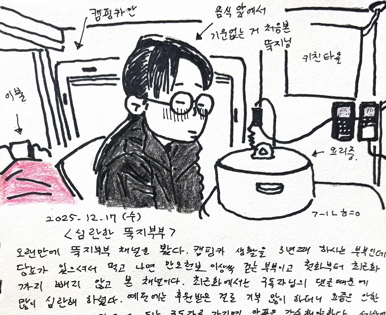 오랜만에 뚝지부부 채널을 봤다. 캠핑카 생활을 3년째 하시는 부부인데 당뇨가 있으셔서 늘 먹고 나면 만오천보 이상씩 걷는 부부이고 첫화부터 최근화까지 빼지 않고 본 채널이다. 최근화에서는 구독자님의 댓글때문에 많이 심란해 하셨다. 예전에는 후원받은 걸로 기부 많이 하더니 요즘은 안한다는 댓글. 20만정도 되는 구독자를 가지면 악플은 감수해야한다. 세상엔 이상한 사람이 워낙 많아서 강한 멘탈이 없으면 유튜브 하기 쉽지 않다. 심란한 마음이었지만 정말 오랜만에 호떡을 먹고 기분이 좋아지고 바닷가에 있는 대형 게 조형물을 보고 먹는 상상을 하는 뚝지님을 보면 웃음이 터져나온다. 이 부부를 보고 있으면 귀엽고 사랑스럽다. 그리고 웃기다. (우리 박조김비 채널은 고작 1600명이라 악플이 그리 많지 않지만) 그래도 다행스러운건 다음화에서 선배님들(이들 부부는 구독자님들을 인생 선배라는 의미에서 “선배님들”이라고 부른다)의 선플때문에 다시 기운을 차렸다는 것이다. 촬영과 편집일이 얼마나 손이 많이가고 시간과 집중이라는 품을 들이는 일인가. 그러니 후원받은걸 생활비로 쓰는게 나쁜게 아님을 아셨음 좋겠다.