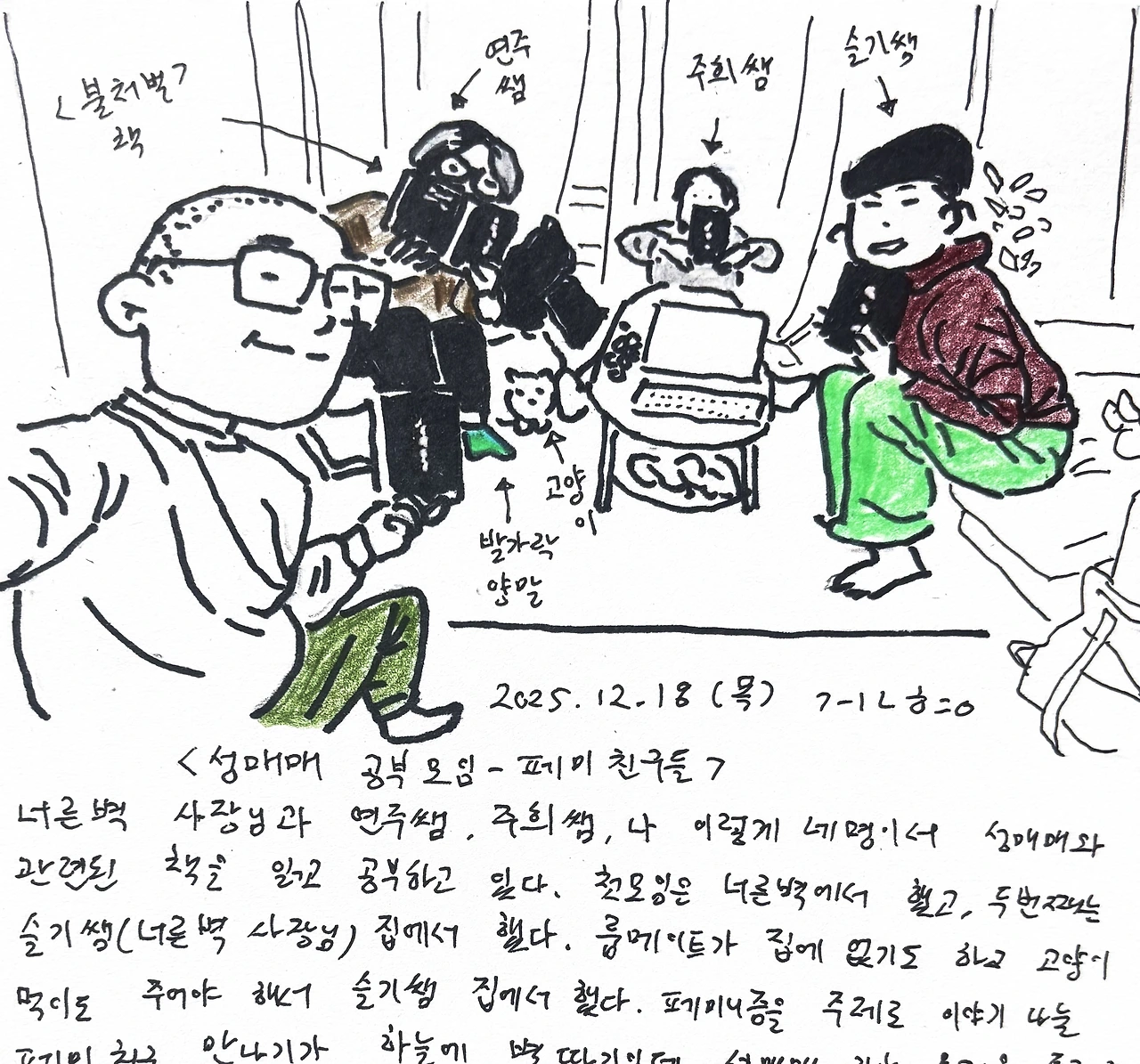 너른벽 사장님과 연주쌤, 주희쌤, 나 이렇게 네명이서 성매매와 관련된 책을 읽고 공부하고 있다. 첫모임은 너른벽에서 했고, 두번째는 슬기쌤(너른벽 사장남)집에서 했다. 룸메이트가 집에 없기도 하고 고양이 먹이도 주어야 해서 슬기쌤 집에서 했다. 페미니즘을 주제로 이야기 나눌 페미친구 만나기가 하늘에 별따기인데 성매매 라는 무거운 주제를 혼쾌히 공부하자고 모일수 있는 이 친구들이 참 반갑고 귀하고 고맙다. 늘 새 멤버를 구합니다라고 공부모임 기록을 남기지만, 연락오는 사람은 없다. 목요일엔 주희쌤과 슬기쌤이 서울에 성노동자 추모행동에 다녀온다고 했다. 성산업 현장에서 일하시는 당사자분들의 발언도 있고 무용공연도 있다고 했다. 주희쌤은 경주 성매매집결지 관련 다큐를 찍었고 학교에서는 신문사에서 일했는데 곧 졸업이시다. 포항에서 경주로 올까 생각중이신거 같아서 경주에 오면 참 좋겠다 생각했다. 세번째 모임에는 두번째 책으로 <레이디 크레딧> 1,2장을 읽어오기로 했다. 1월 8일 목요일 너른벽에서 19시에 모이기로 했다. #그림일기