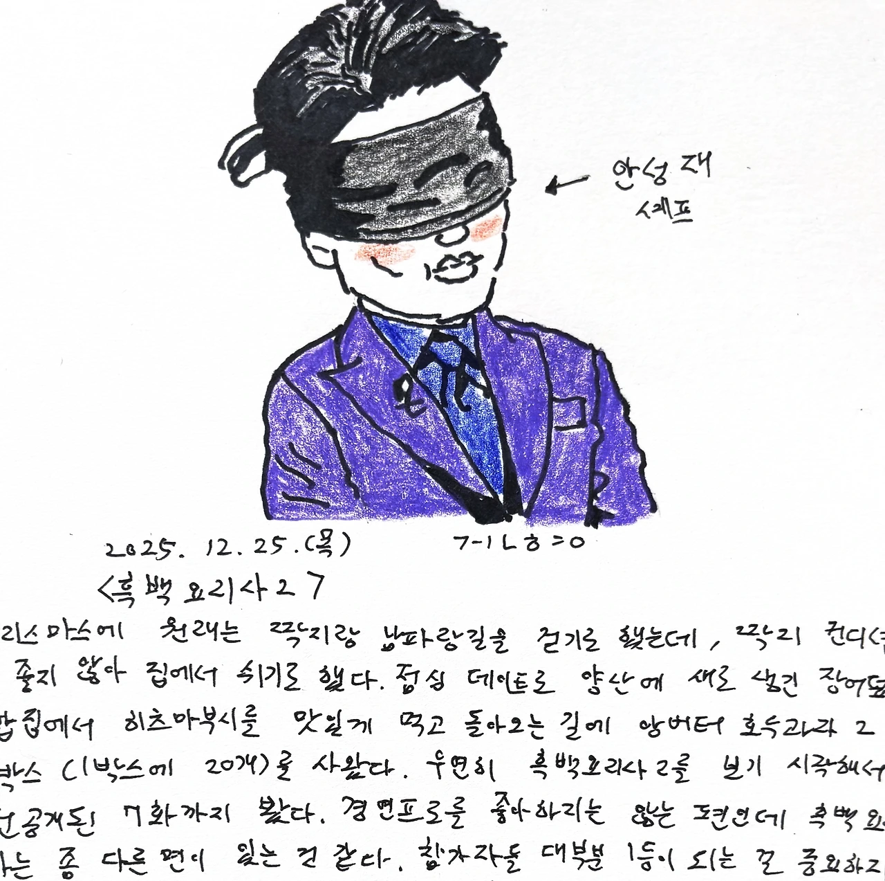 크리스마스에 원래는 짝지랑 남파랑길을 걷기로 했는데, 짝지 컨디션이 좋지 않아 집에서 쉬기로 했다. 점심 데이트로 양산에 새로 생긴 장어덮밥집에서 히츠마부시를 맛있게 먹고 돌아오는 길에 앙버터호두과자 2박스(1박스에 20개)를 사왔다. 우연히 흑백요리사2를 보기 시작해서 선공개된 7화까지 봤다. 경연프로를 좋아하지는 않는 편인데 흑백요리사는 좀 다른 면이 있는 것 같다. 참가자들 대부분 1등이 되는걸 중요하지 않게 생각한다는 것. 몸으로 오랜시간 요리를 해온 육체노동자로서 장인의 측면이 있다보니 서로를 존중하는 태도. 내가 모르는 맛의 세계와 요리의 세계에 대한 디테일한 묘사들이 신기하고 흥미로웠다. 팀 대항전에서는 1차 2차 모두 백요리사들이 이겼지만, 3차에서 한사람 점수차이까지 좁혀져 다음회를 궁금하게 만드는 스릴러적인 긴장감까지 재미있는 요소들이 참 많다. 흑백요리사1에 참여했던 최강록이 히든 요리사로 등장해 올라왔고, 선재스님, 중식마녀, 요리괴물 등의 인물들이 흥미로웠다. 40년 50년 요리한 대선배 요리사들도 현장에서 오래 일한 노련함과 인격이 보여 멋졌고, 자신들을 내새우기보다는 후배들에게 더 기회를 주려는 모습도 좋았다.