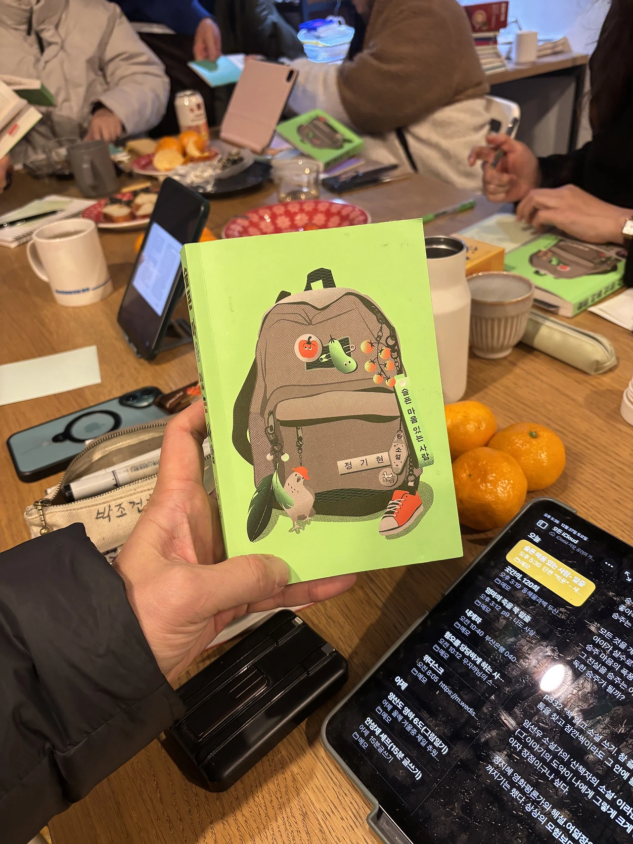 어제 짝지랑 부산 중앙동에 ‘문학의 곳간’ 모임에 다녀왔습니다. 어제는 120회 모임이었고 선정도서는 정기현 작가의 <슬픈 마음 있는 사람>이었습니다. 보통은 6명 내외로 독서모임을 하는 편인데 어젠 사람이 많아 9명이나 되었네요. 멀리 합천에서 내려오시는 지원쌤, 환경과 기후 문제와 관련된 정책 활동을 하시는 상현쌤, 하고 싶은 것들이 너무너무 많은 맥시멈리스트이자 꽉찬 J인 소연쌤, 인권 활동가들을 지원하는 일을 하시는 아름쌤이 자주 뵙는 분들이고 원동에서 오신 배경열 쌤, 대성쌤과 같은 연구소에 계셨던 지현쌤이 함께해 주셨습니다. 경열선생님은 제 북토크에 저희 부부의 책들을 왕창 들고 오셔서 사인을 받으시고 제 북토크도 너무 집중해서 들어주셨는데, 문학의 곳간 모임이 궁금하셨는지 짝지에게 대성쌤 연락처를 물어 저번에 대성쌤이 운영하는 글쓰기 모임에 한번 오셨고, 이번 문학의 곳간 모임은 처음오셔서 너무 반가웠습니다.
