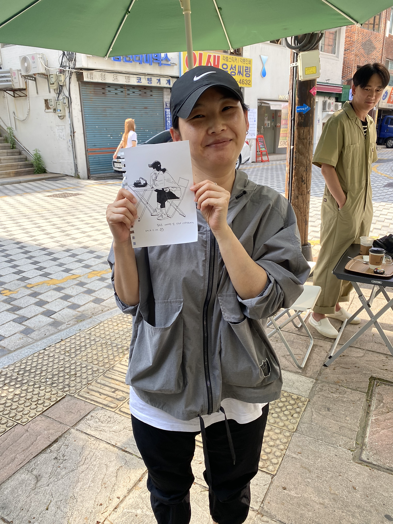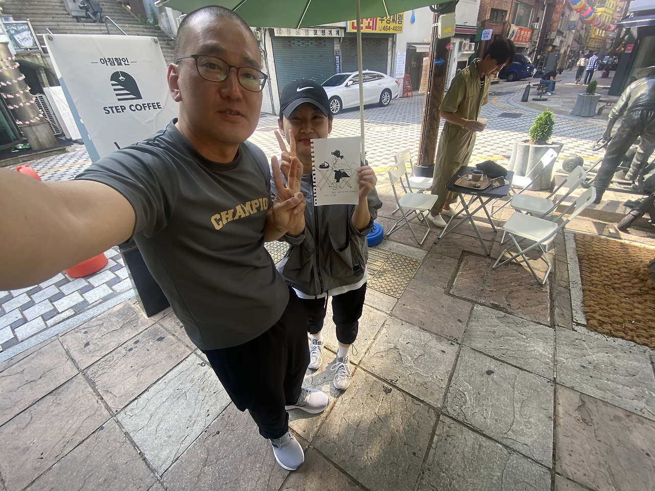 그 손님은 그림이 너무 마음에 드셨는지, 나중에 내게 와서 같이 사진을 찍어도 된다고 하셔서 기념촬영을 했다. 손님에게도 나에게도 좋은 추억이 되었으면 하는 바람으로. 다음에는 동영상으로 그림 전달하고 놀라는 모습을 찍어서 올려봐야겠다. 그 미국 작가님처럼 말이다. ^^