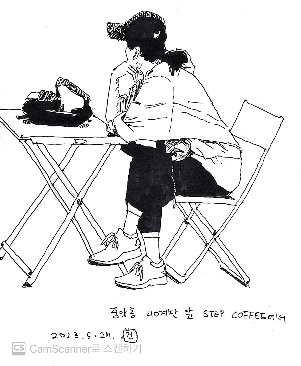 짝지가 독서모임에 가고 나는 40계단 STEP COFFEE에서 그림을 그리며 기다리기로 했다. 문득 미국 지하철에서 즉석 드로잉으로 그림을 그려서 직접 선물로 드리는 작가님의 모습이 생각이 나서 나는 그렇게는 안되고, 내 앞에 있는 손님을 살짝 찍어서 빠른 시간안에 드로잉을 했다. 가시기전에 완성한다는 마음으로 20분정도 걸린 것 같다. 그 미국작가님처럼 드로잉을 전해 드리고 놀라는 모습을 찍으려고 했으나, 손님이 마스크를 안쓰셔서 그렇다 하셔서 동영상 찍는건 바로 스톱하고 내자리로 돌아와서 글을 썼다.