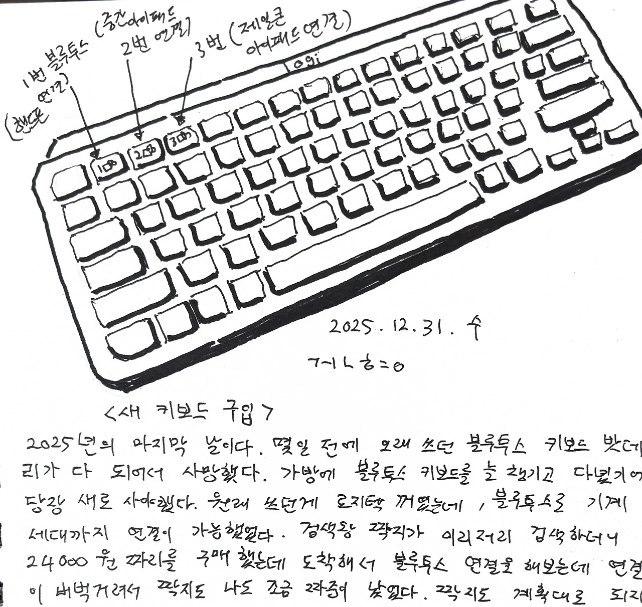 2025년의 마지막 날이다. 몇일 전에 오래 쓰던 블루투스 키보드 밧데리가 다 되어서 사망했다. 가방에 블루투스 키보드를 늘 챙기고 다녔기에 당장 새로 사야했다. 원래쓰던게 로지텍 꺼였는데, 블루투스로 기계 세대까지 연결이 가능했었다. 검색왕 짝지가 이리지리 검색하더니 24000원짜리를 구매했는데 도착해서 블루투스 연결을 해보는데 연결이 버벅거려서 짝지도 나도 조금 짜증이 났었다. 짝지도 계획대로 되지 않으면 승질이 나는 사람. 왜냐면 그 구입하기 전까지 부지런히 검색을 하고 결정한 선택이었기 때문이다. 내가 짝지에게 “그럴수도 있죠~” 라며 토닥토닥. 그래서 원래 제품 반품하고 검색과 유튜브 사용후기를 열심히 또 보더니 조금 비싼걸 구매했다. 그러다가 새로 주문하는게 내 큰 손에 비해 작은 거 같다며 기왕 사는거 로지텍 제품으로 큼지막한걸로 사자고 또 바꾸었다. 키보드를 내 몸처럼 챙겨다니며 쓰는 사람으로서 9만원대 키보드가 비싼게 아니라 생각하고 새로 구입했다. 그리고, 새 키보드로 그림일기 글을 쓰고 있다. 2025년의 마지막날의 일기로서 구 키보드를 버리고 새 키보드를 사용하는 내용이 적절한 거 같다. 앞으로는 글을 더 성실히 쓰는 작가로서 살겠다는 다짐을 해 본다.